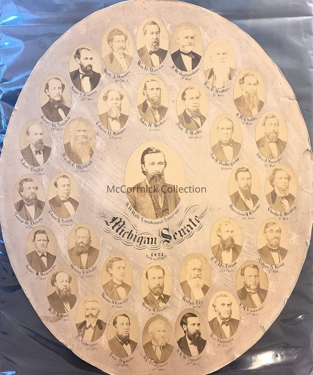 Composite board with photographs of the 1873 Michigan Senate by Lansing photographer B.F. Hall. Calligraphy by Burdick.