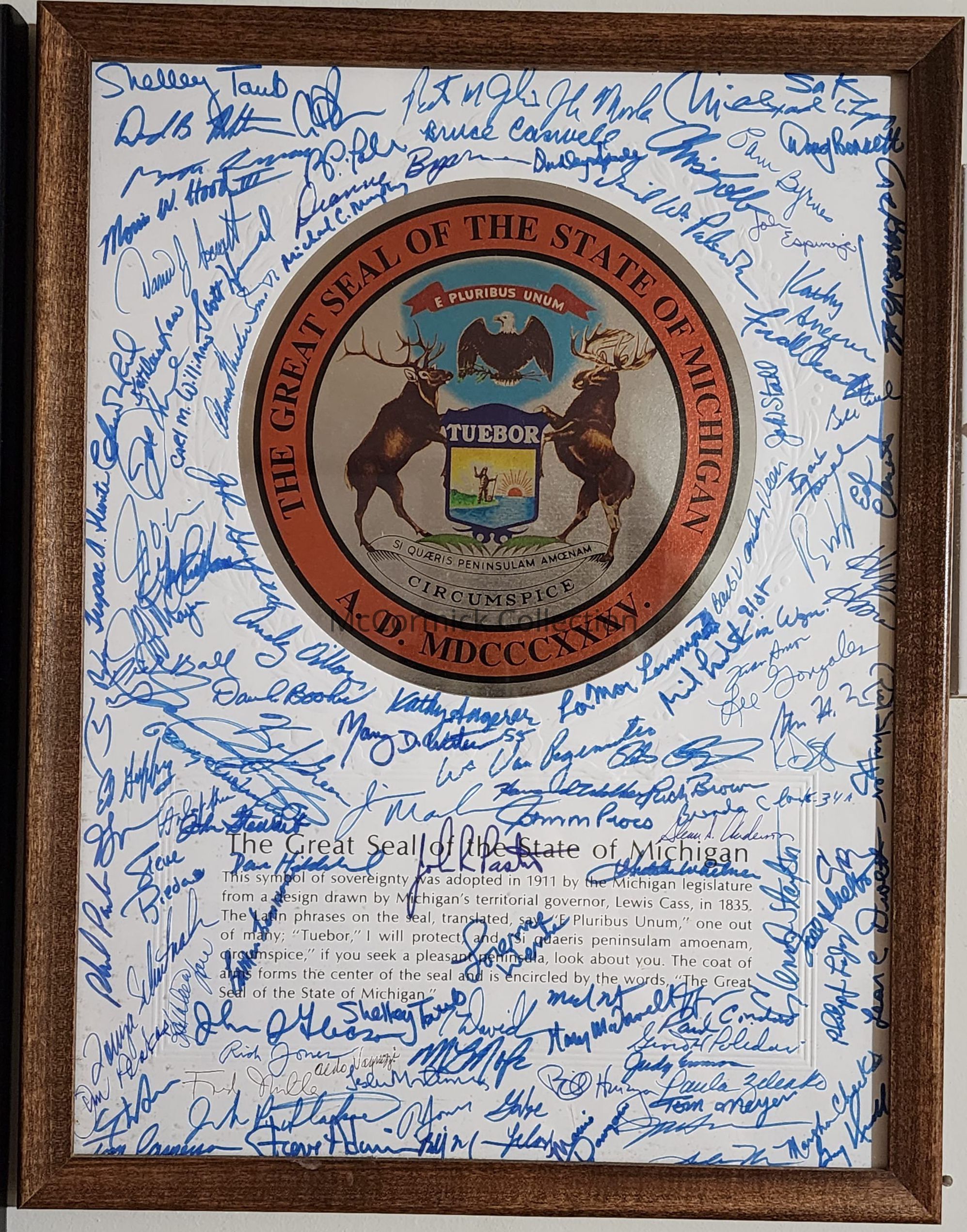 Framed state seal signed by all members of the 2005-2006 Michigan House of Representatives. This includes then Representative Gretchen Whitmer, and several former or future members of Congress. From the Northern Michigan estate of an aide to Governor William Milliken.