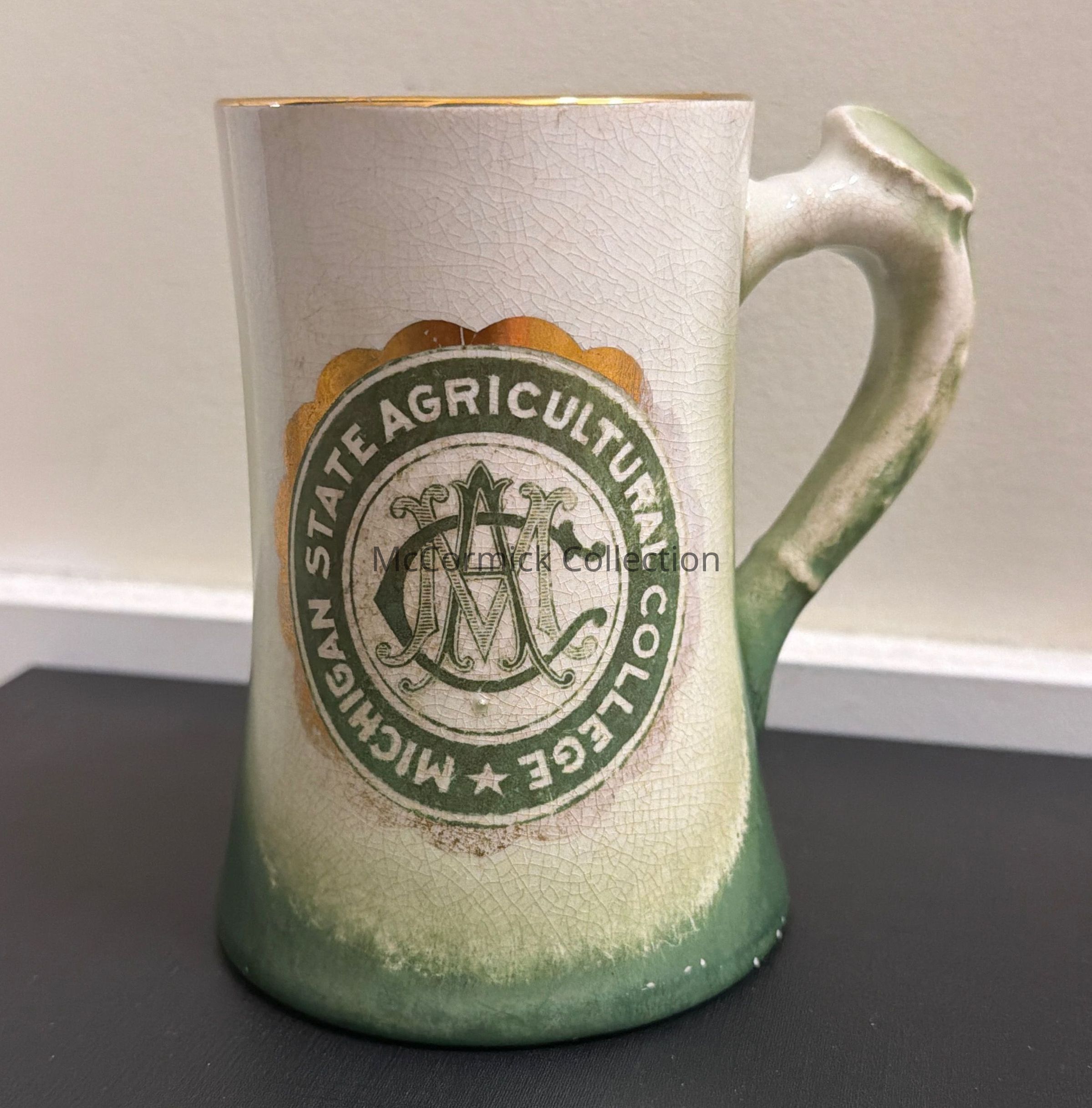 Antique porcelain Michigan State Agricultural College mug/stein, pre-1909. Made by Langrock Bros Mfgs, New York.