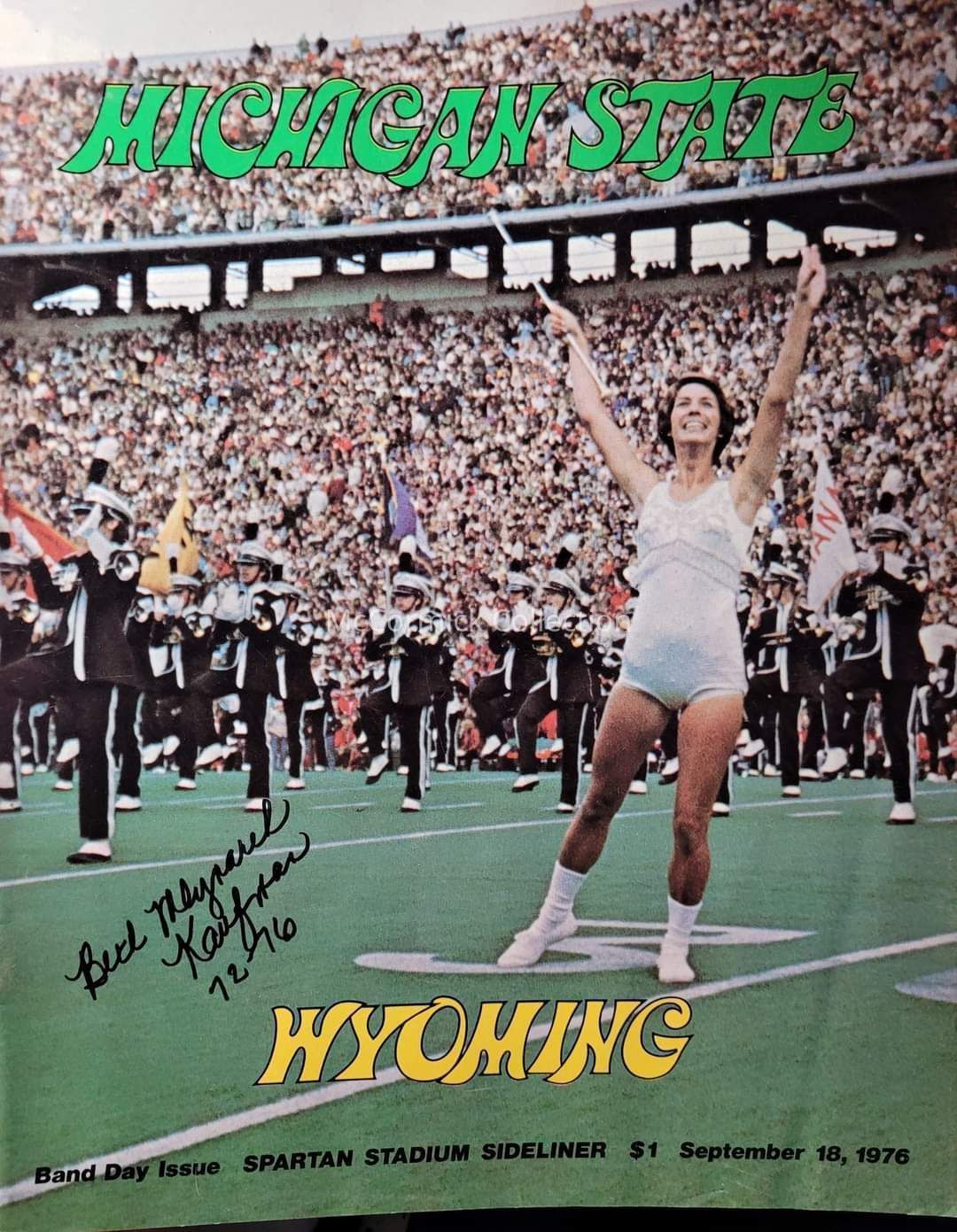 The gameday program from the September 16, 1976 MSU vs Wyoming football game, also Band Day. Pictured on the cover is the DMB and feature twirler Beth Mlynarek Kaufman.