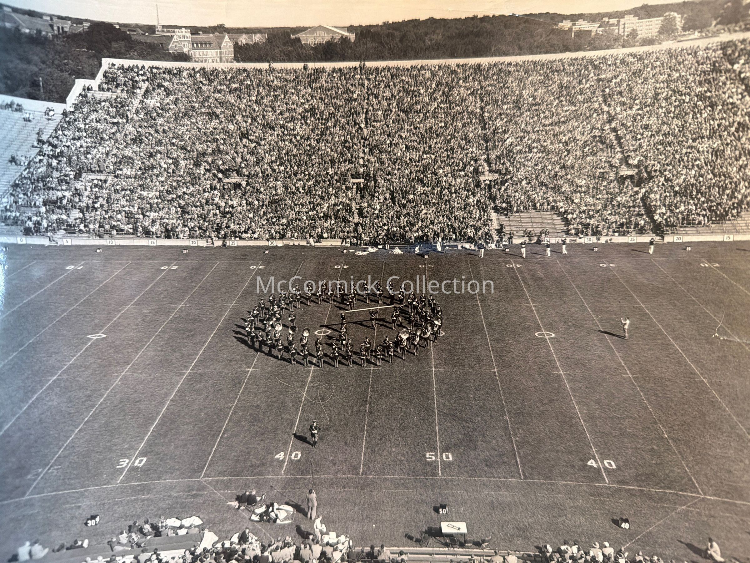 Photographic print of the Michigan State College Spartan Marching Band on the field of Macklin Field Stadium, 1940s, in a clock formation. “Nelson negative” written on back.