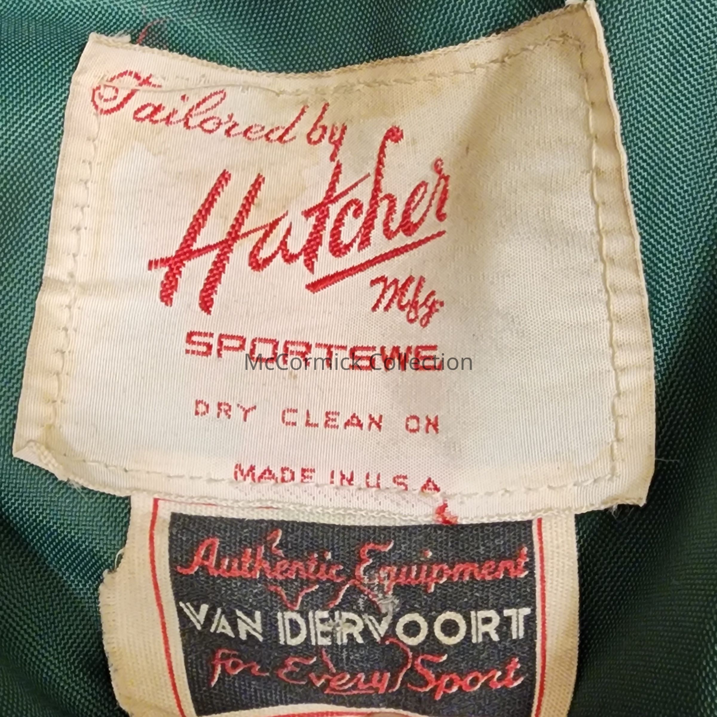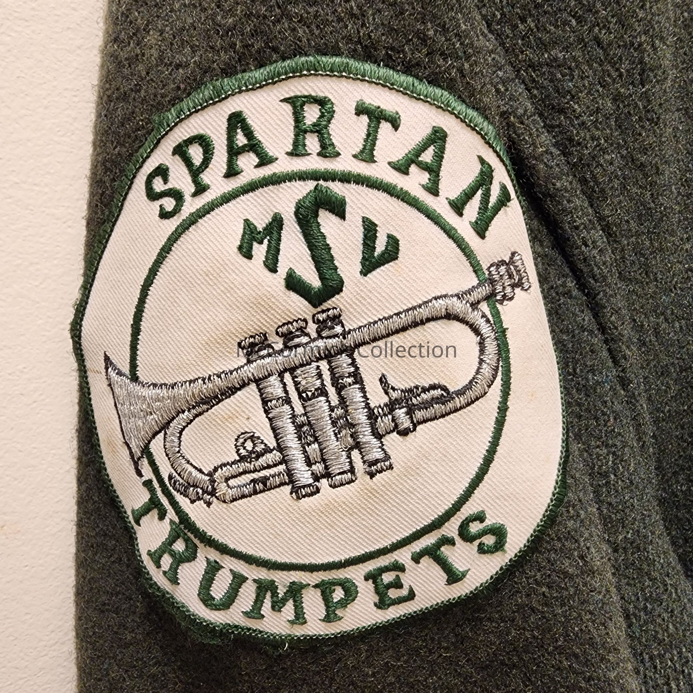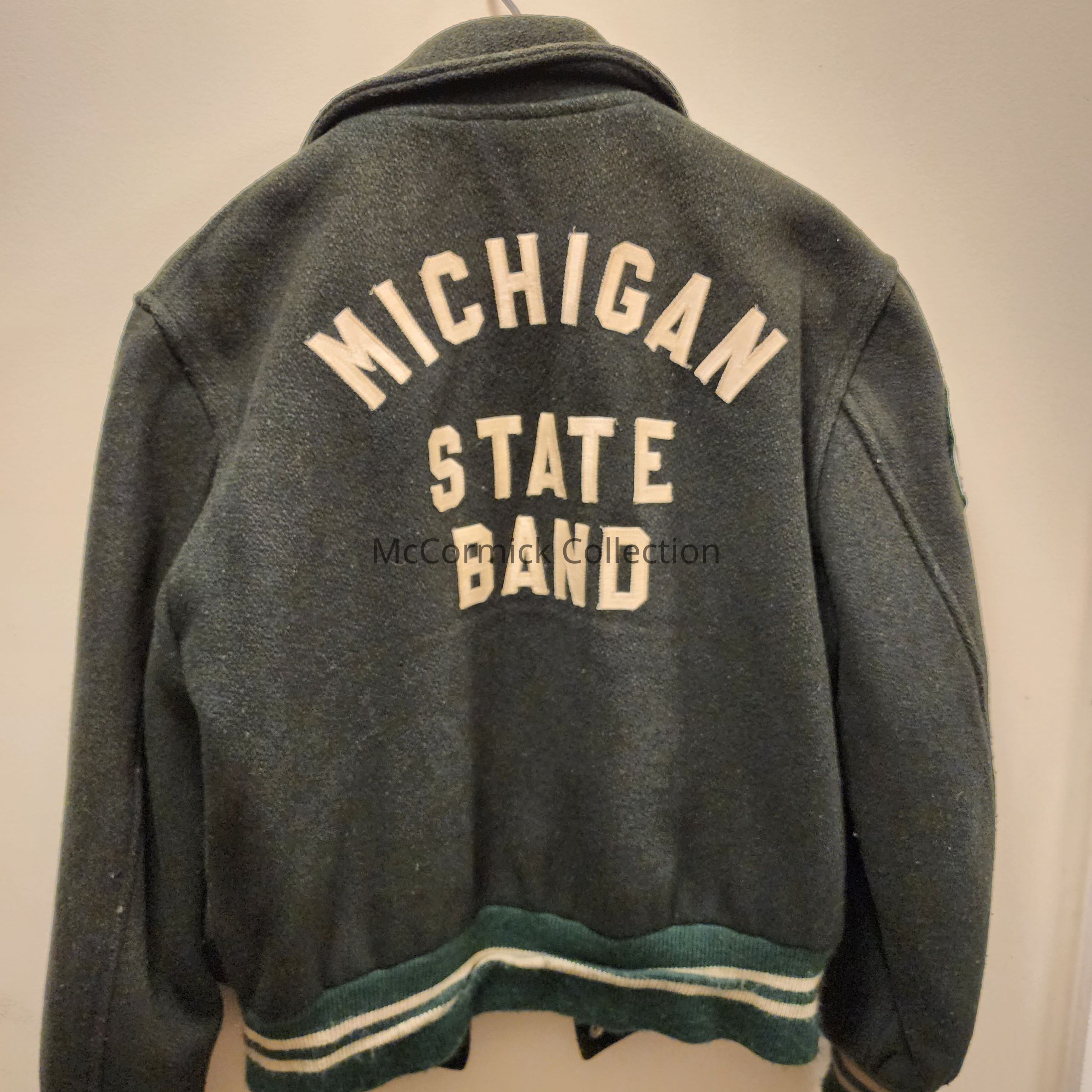 A vintage, circa 1980s, Michigan State Band Jacket worn by a trumpet player. It is small in size and has a green lining. It is tagged by Vandervoort of Lansing. The provenance of this Jacket has been lost.