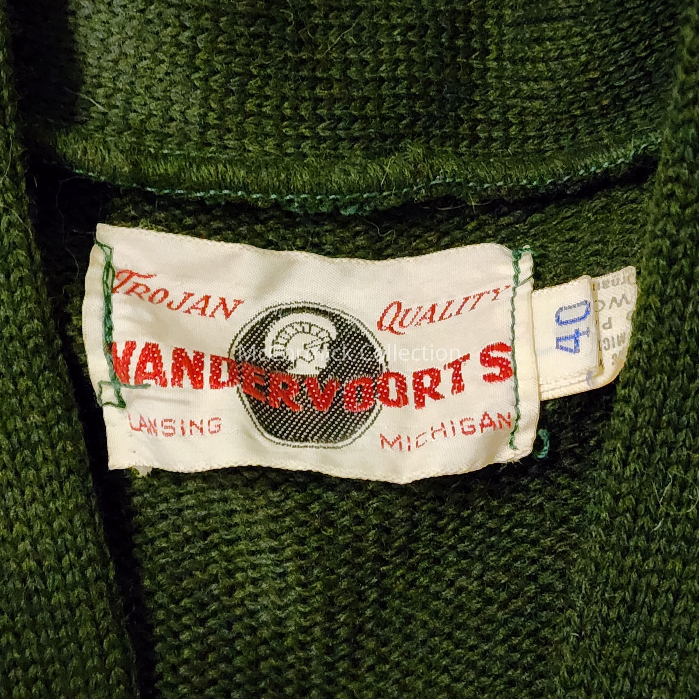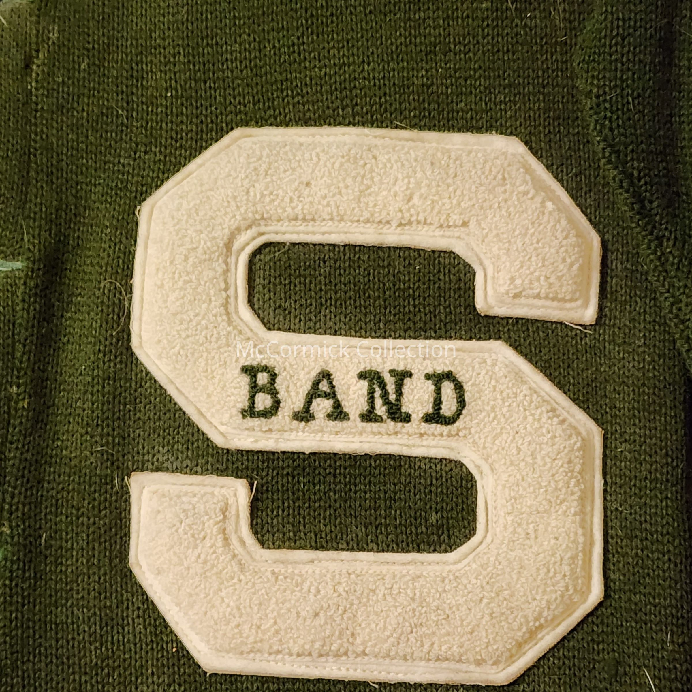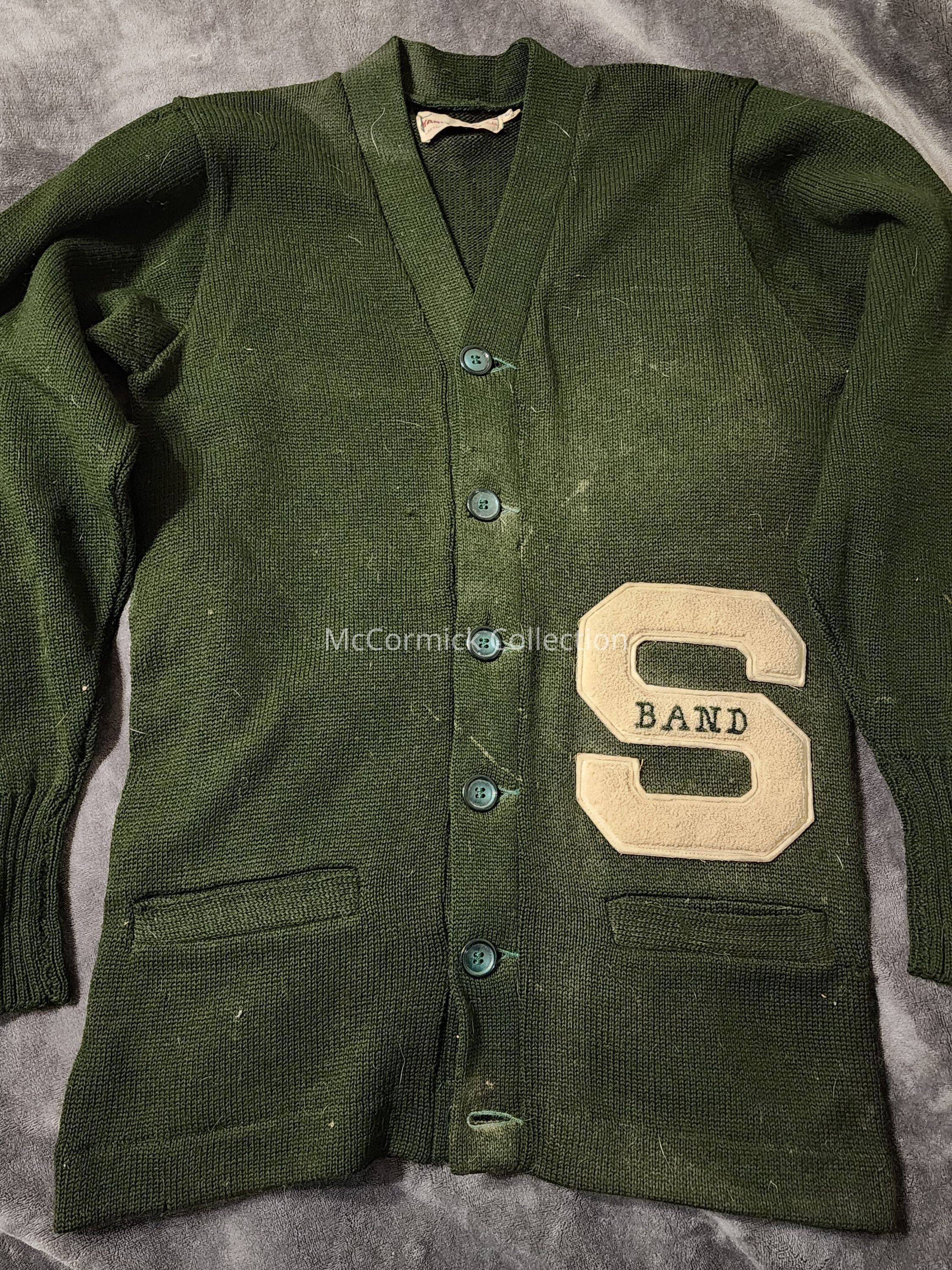 A green wool sweater cardigan from Vandervoorts with a white varsity S letter for participation in band at Michigan State College. Circa 1950s. From the Charles Ross collection.