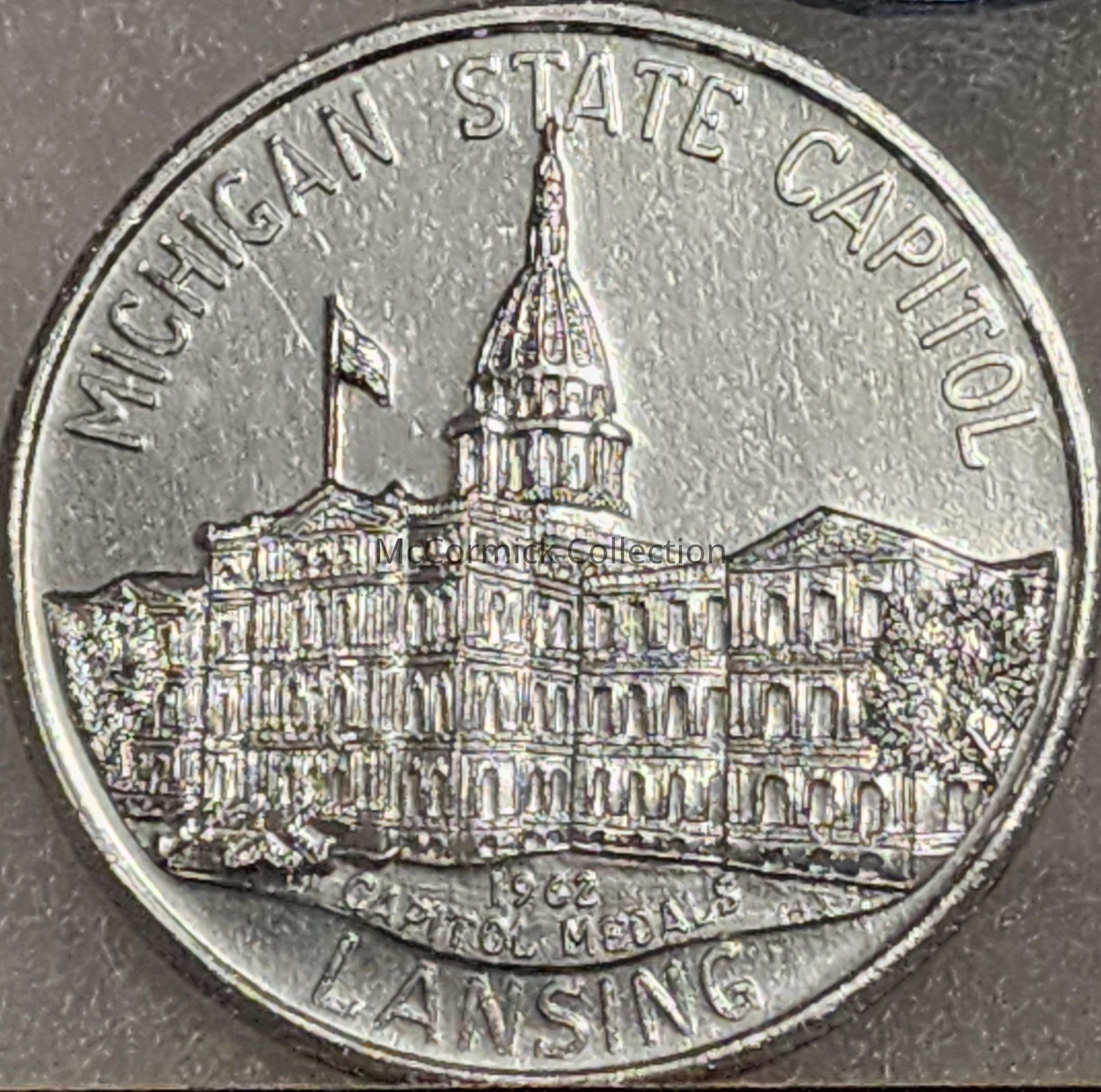 A 1962 medal of the Michigan State Capitol, silver color.