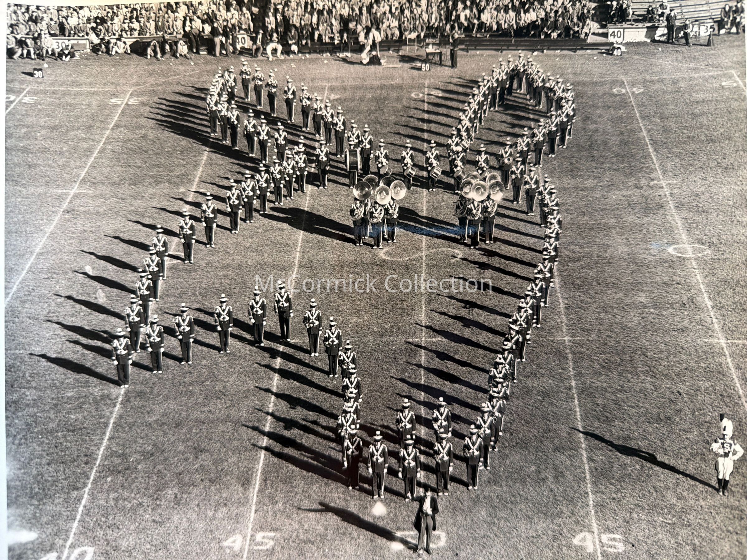 Photographic print of the Michigan State College Spartan Marching Band in a donkey head formation on the field of Spartan Stadium, early 1950s. Gift of Cece Falcone.