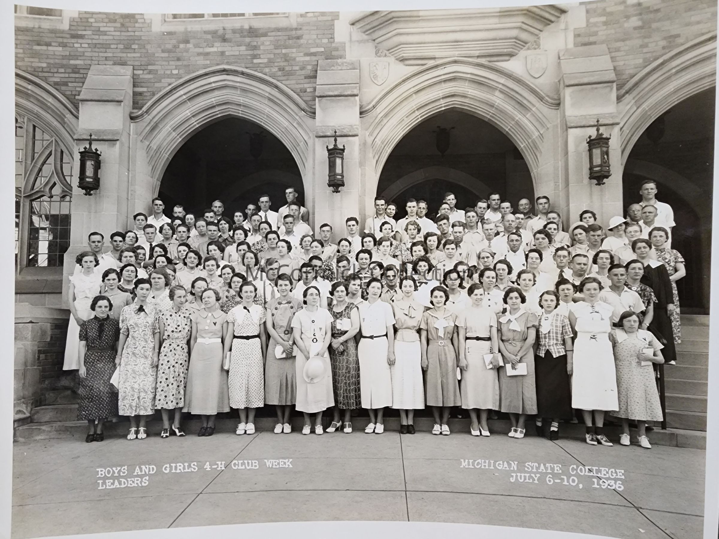 Photograph of Michigan State College Boys and Girls 4-H Club Week Leaders, July 6-10, 1936. Taken on the steps of People's Church.