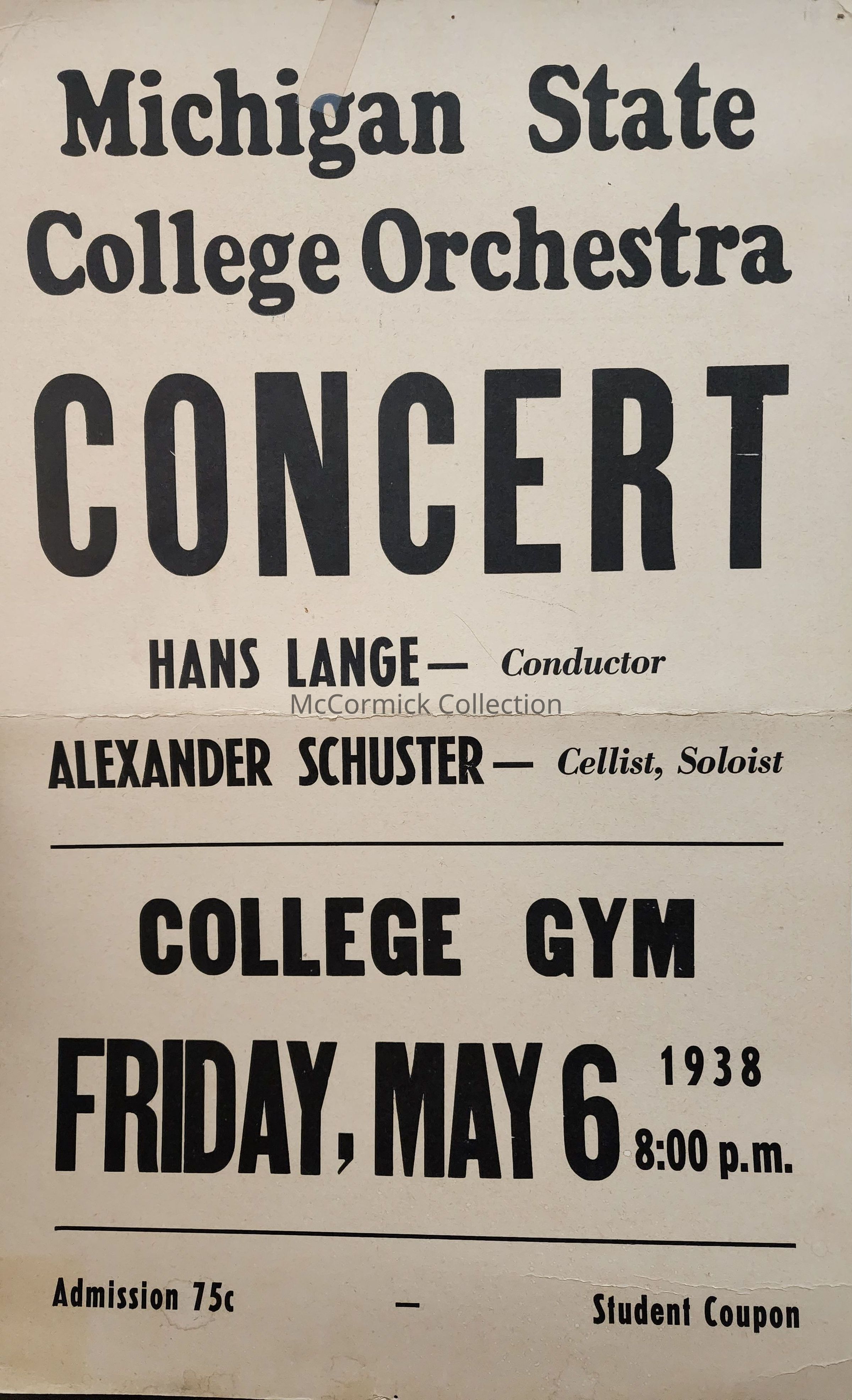 Poster reading "Michigan State College Orchestra Concert, Hans Lange - Conductor, Alexander Schuster - Cellist, Soloist, College Gym, Friday, May 6, 1938, 8:00 p.m., Admission 75 c - Student Coupon."