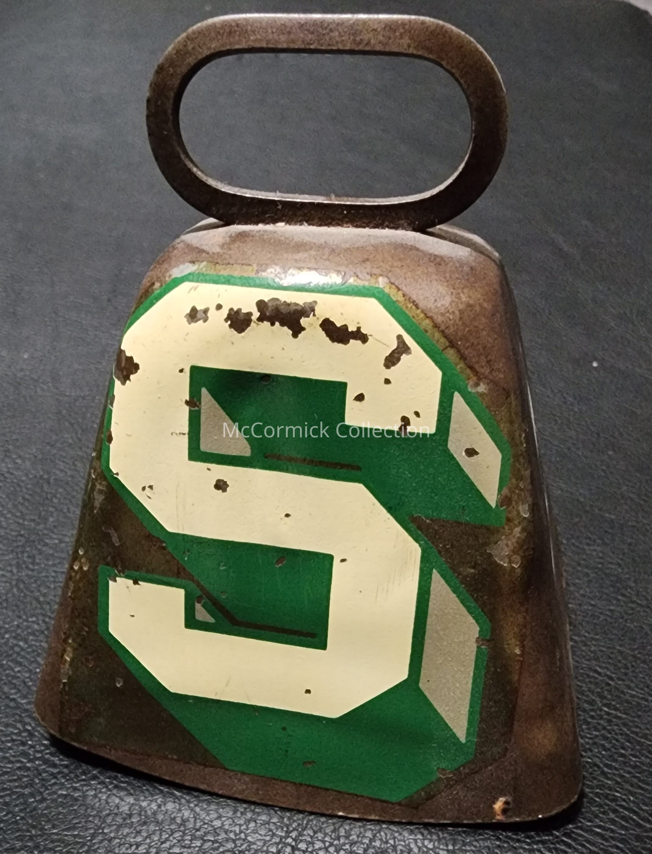 Vintage cow bell with Michigan State block S decal.
