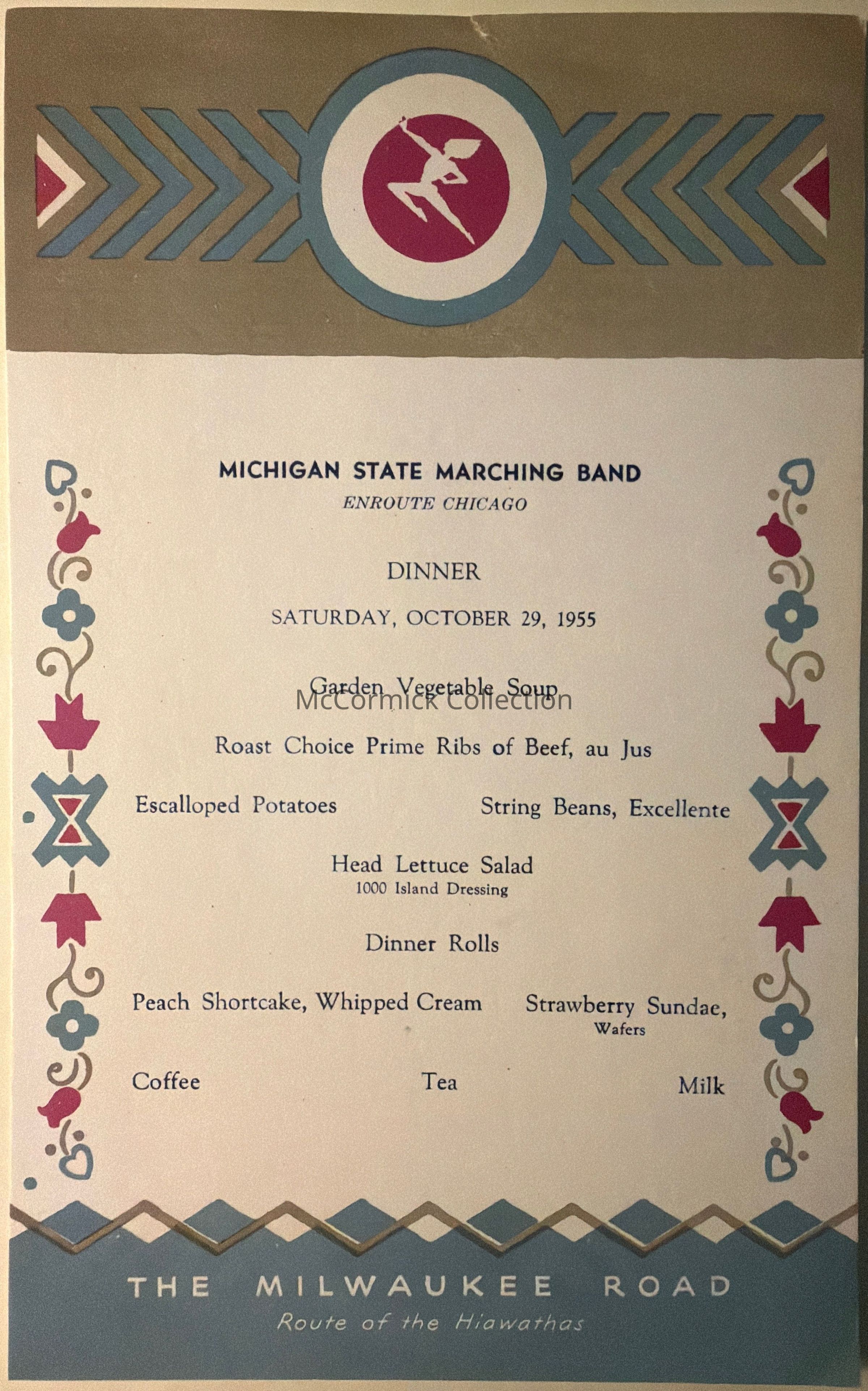 Michigan State Marching Band 1955 Milwaukee Road Train Trip Menu