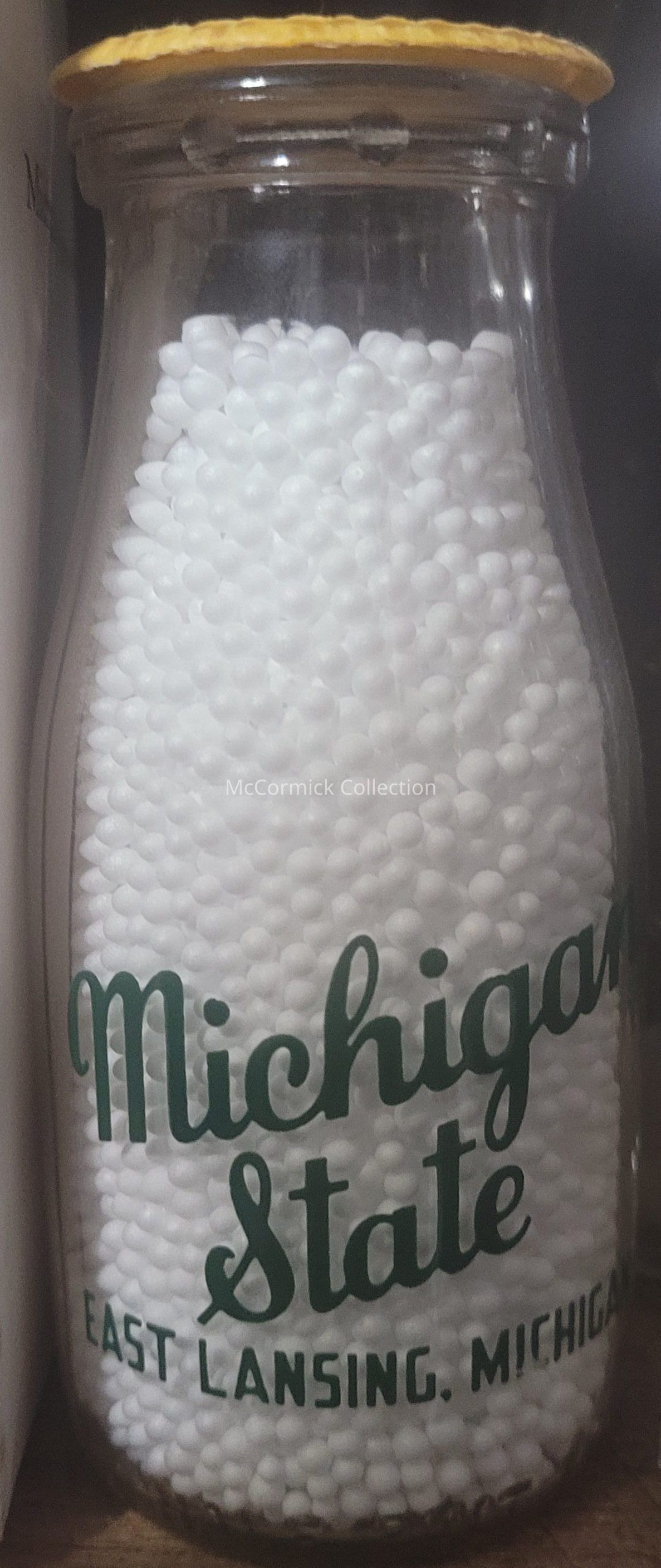 A green pyro half pint bottle from Michigan State, East Lansing.