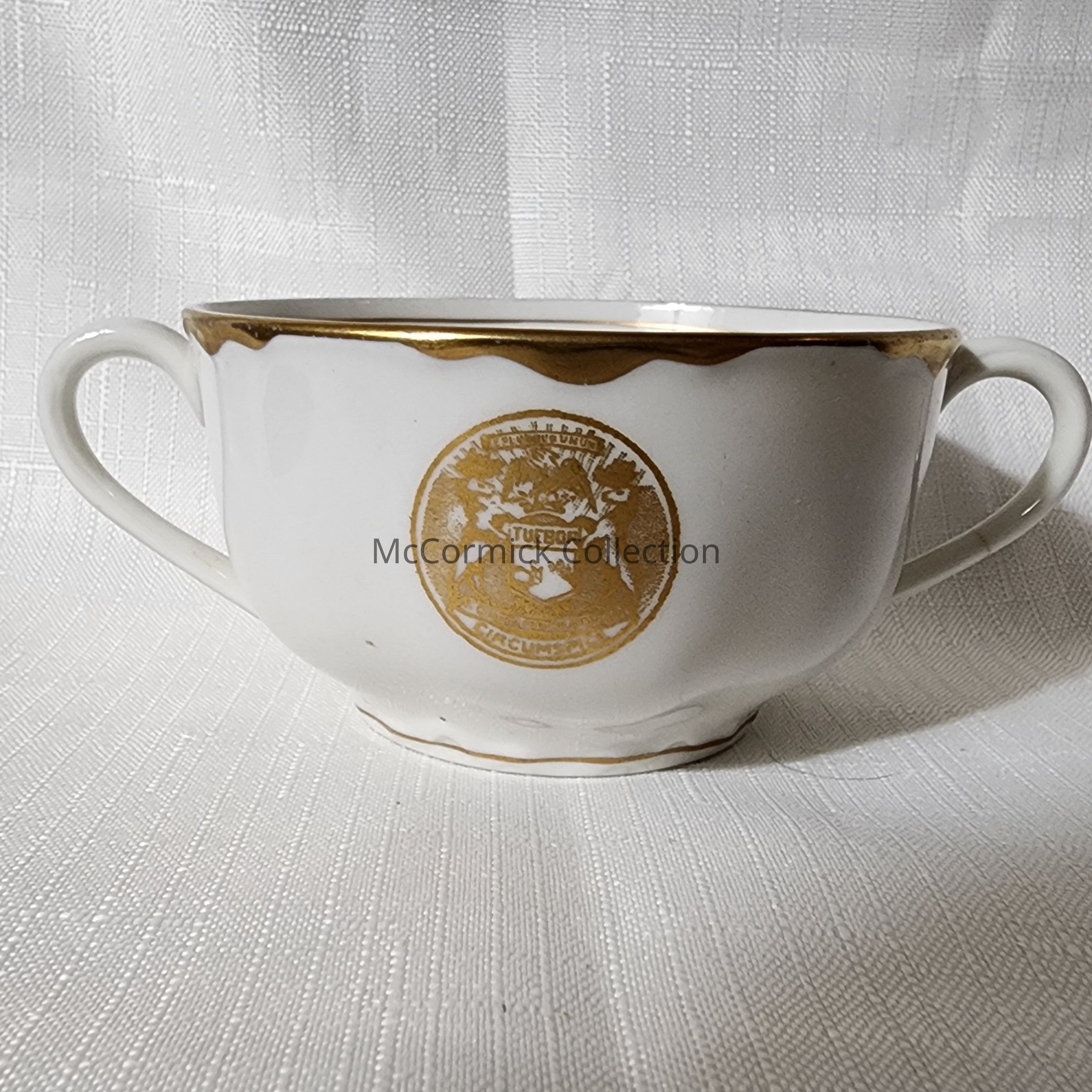 A white and gold porcelain two handled cup with the Michigan State seal or coat of arms.