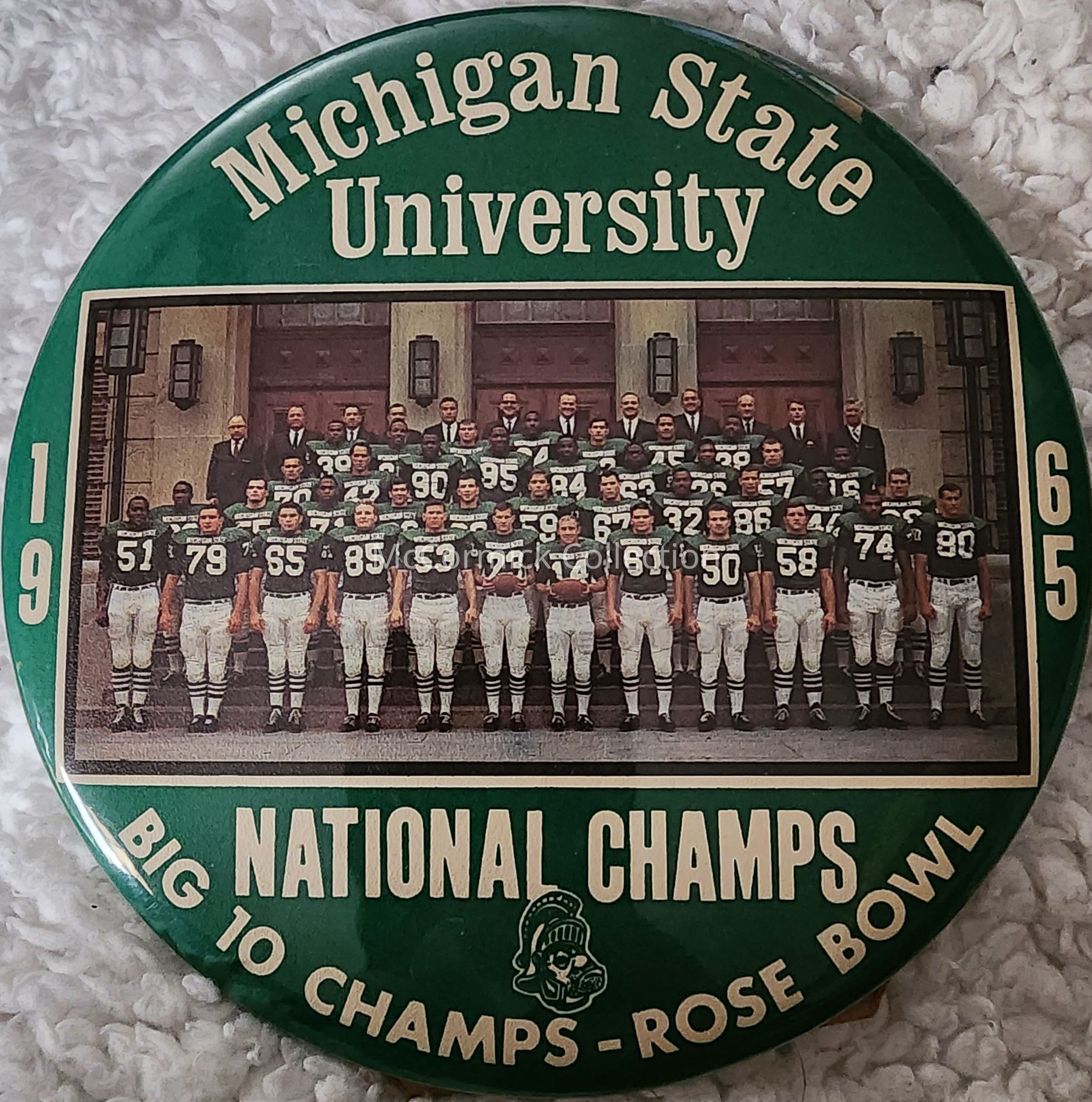 A 6" button for the Michigan State University q965 National Champions, Big 10 Champs, and Rose Bowl Champs. Shows gruff Sparty and a team picture.