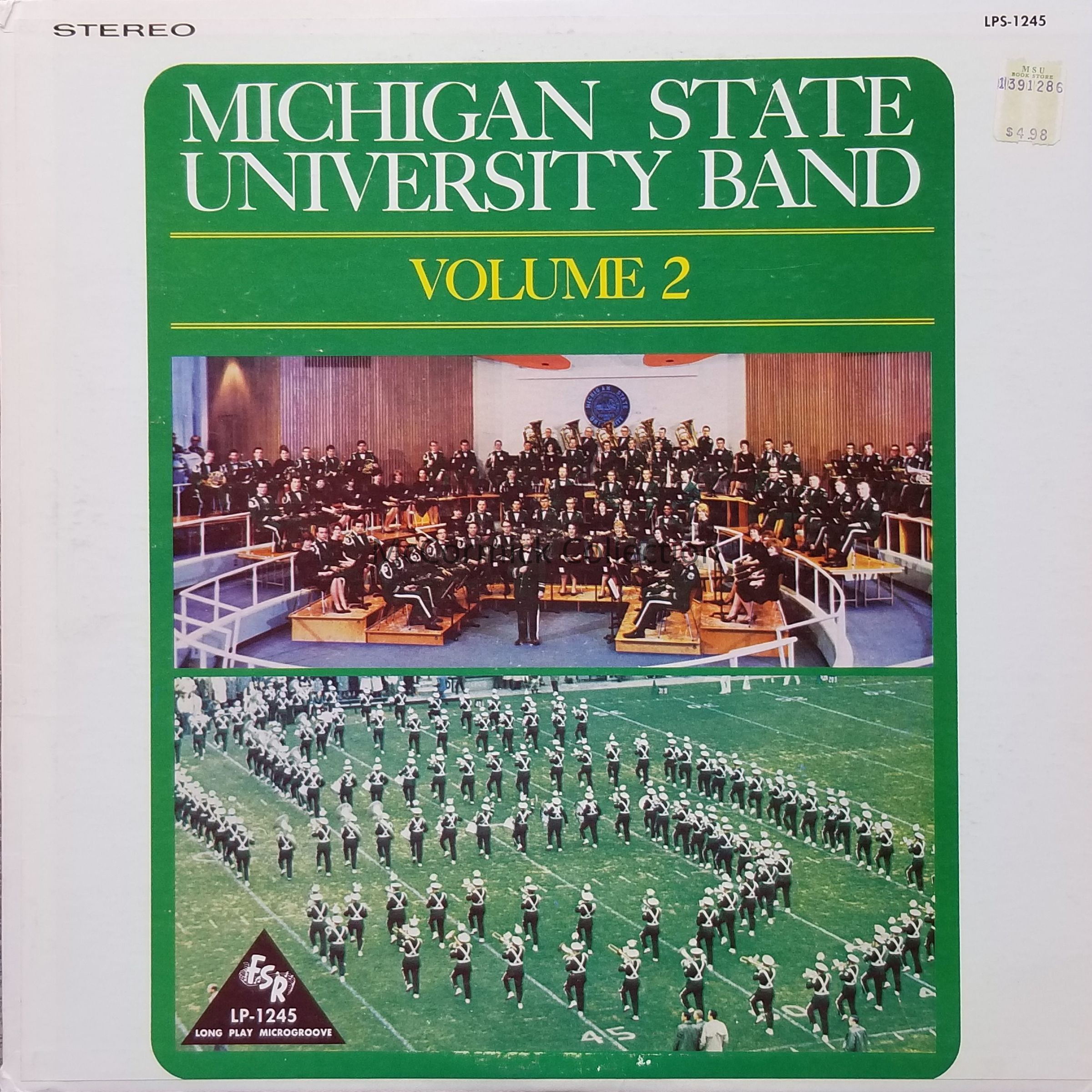 The 1963 volume 2 record of the Michigan State University Band, both the Spartan Marching Band and concert band, under the direction of Leonard Falcone. A MSU Bookstore price tag is still attached.