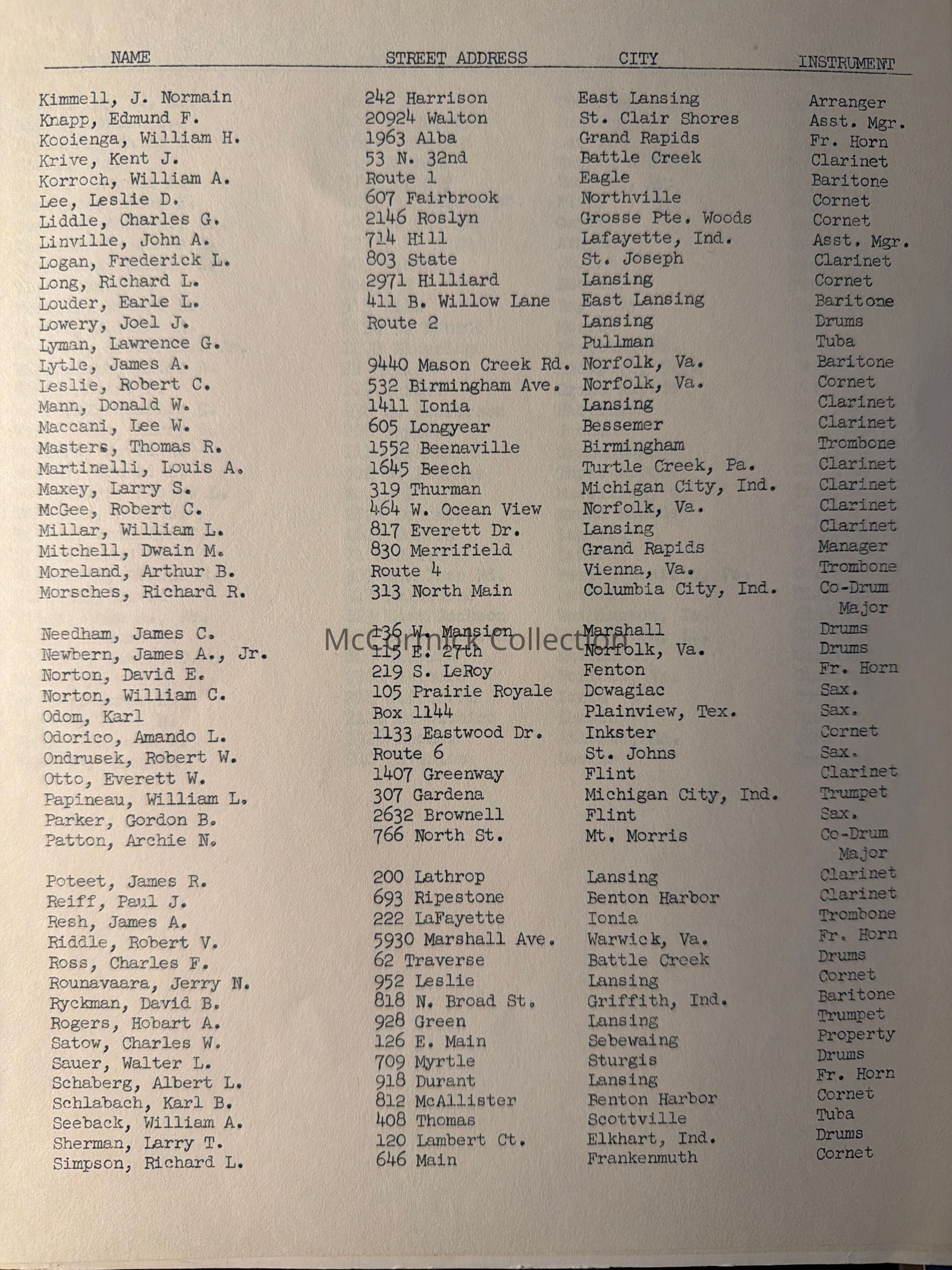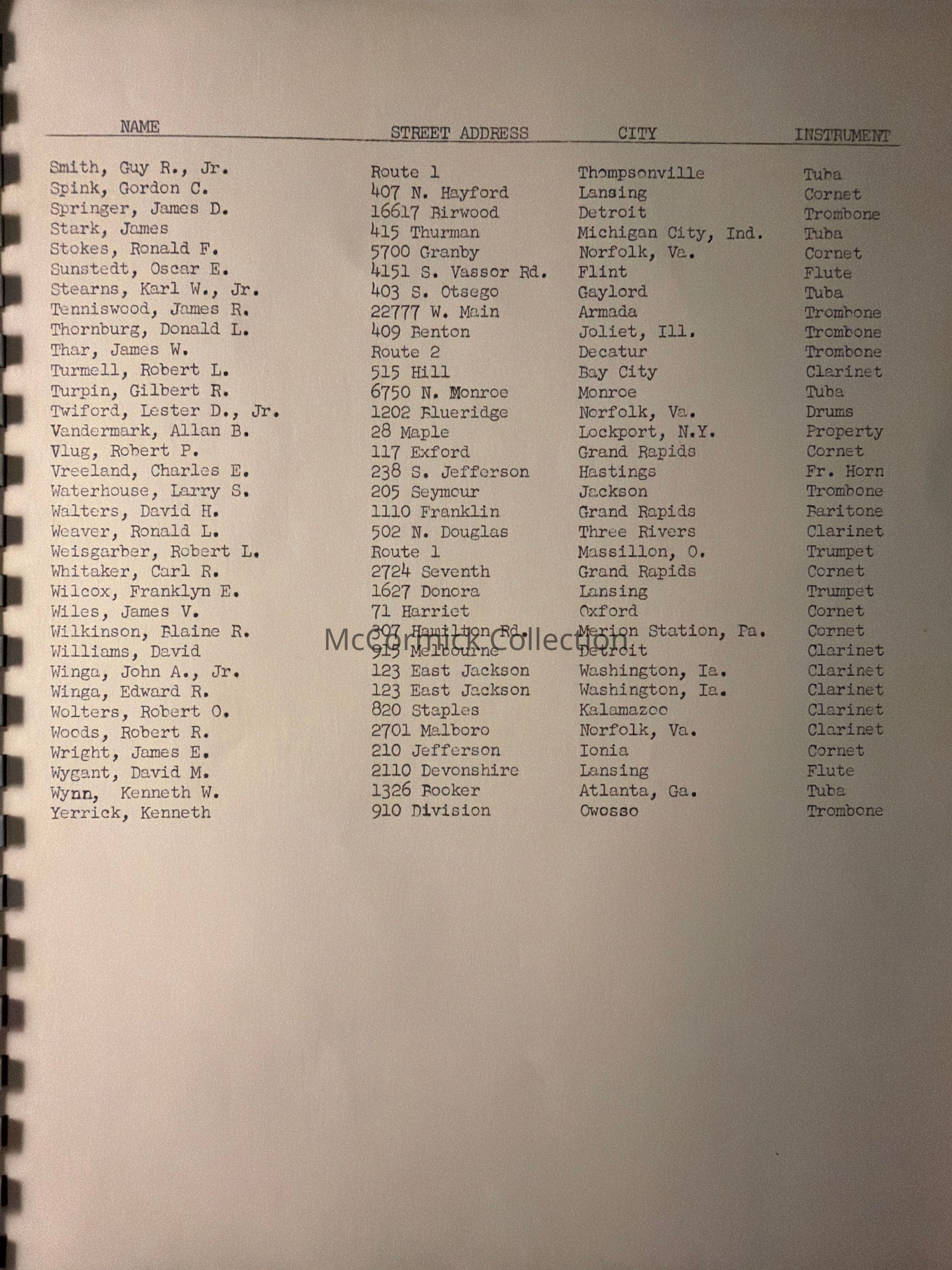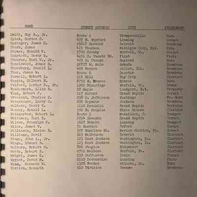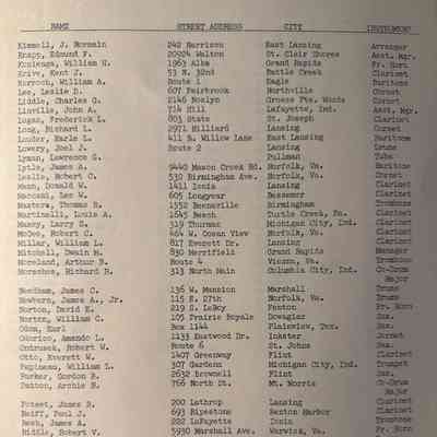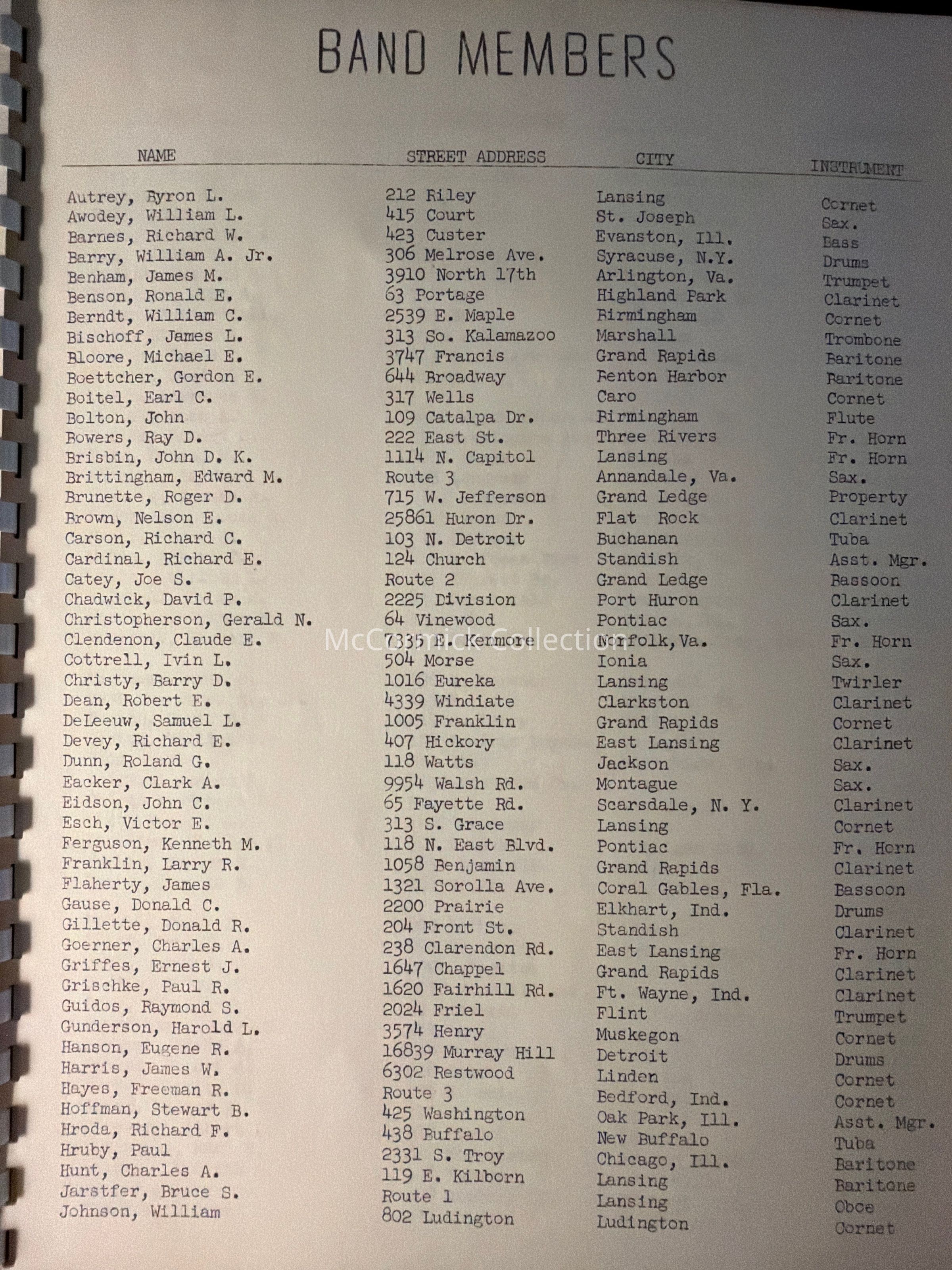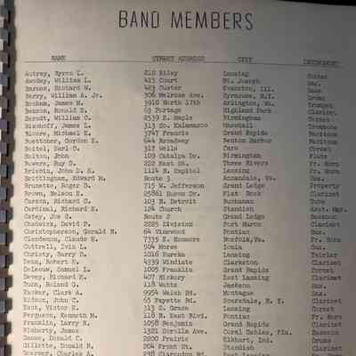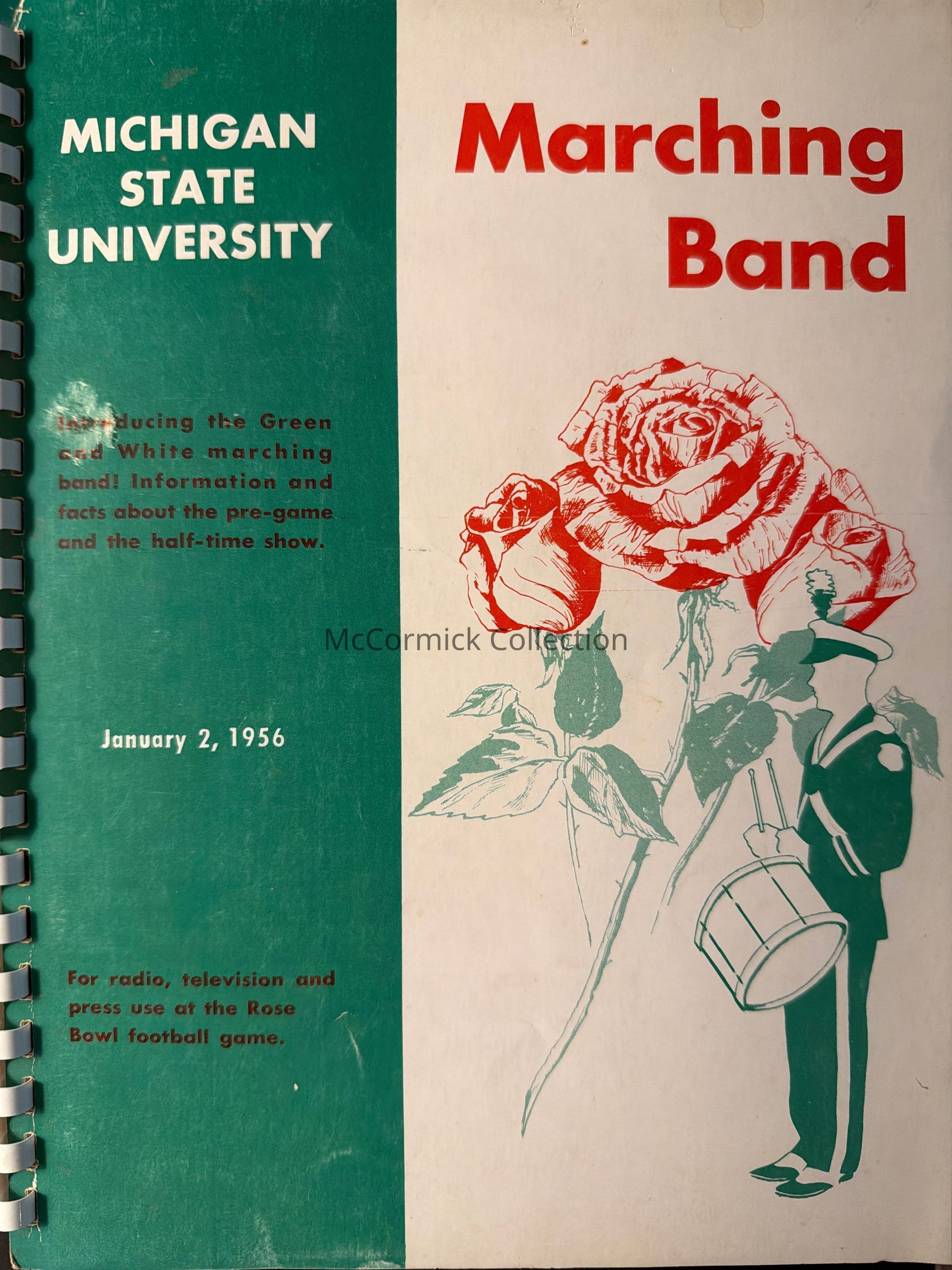 Comb bound booklet media information guide from the Michigan State University Spartan Marching Band, 1956 Rose Bowl. Lists formations and band members.