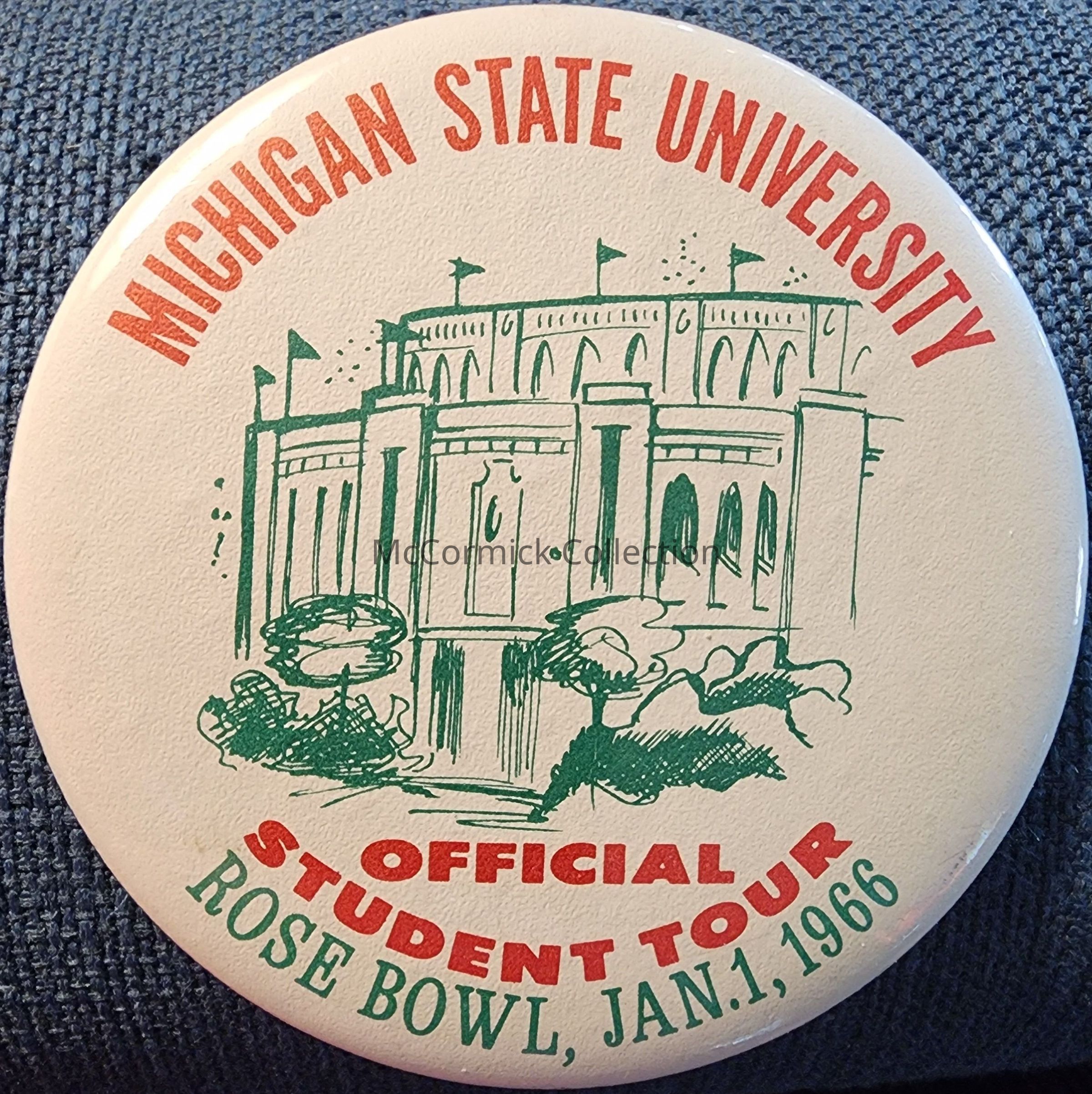 A 3" green, white, and red button for Michigan State's appearance at the 1966 Rose Bowl.