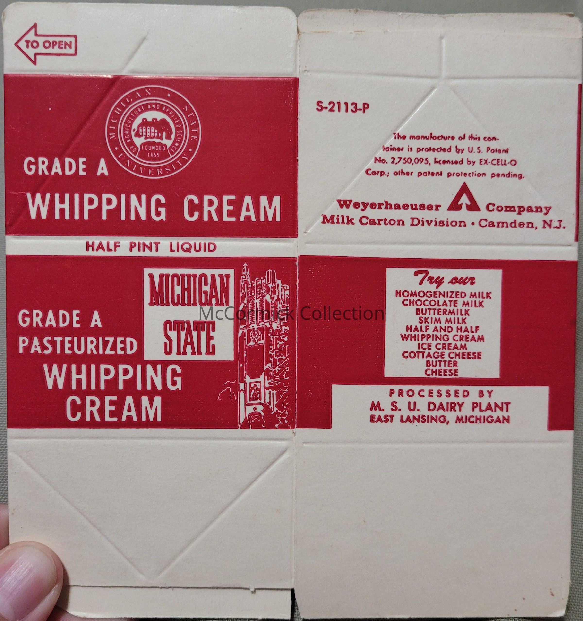 A half pint cardboard carton from Michigan State University Dairy Plant for Whipping Cream.