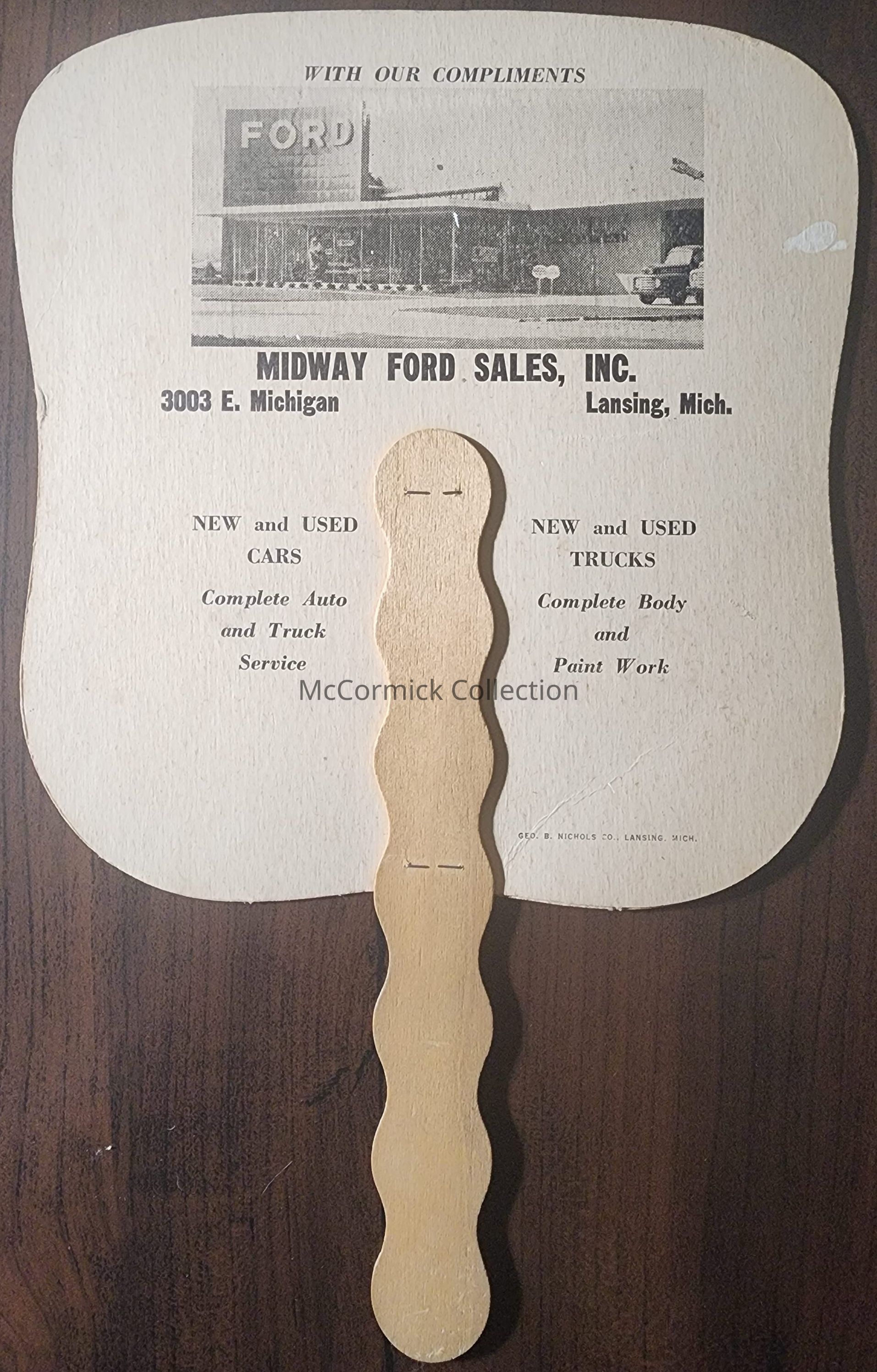 A paper and wood advertising fan for the Midway Ford Sales, Inc. of Lansing.