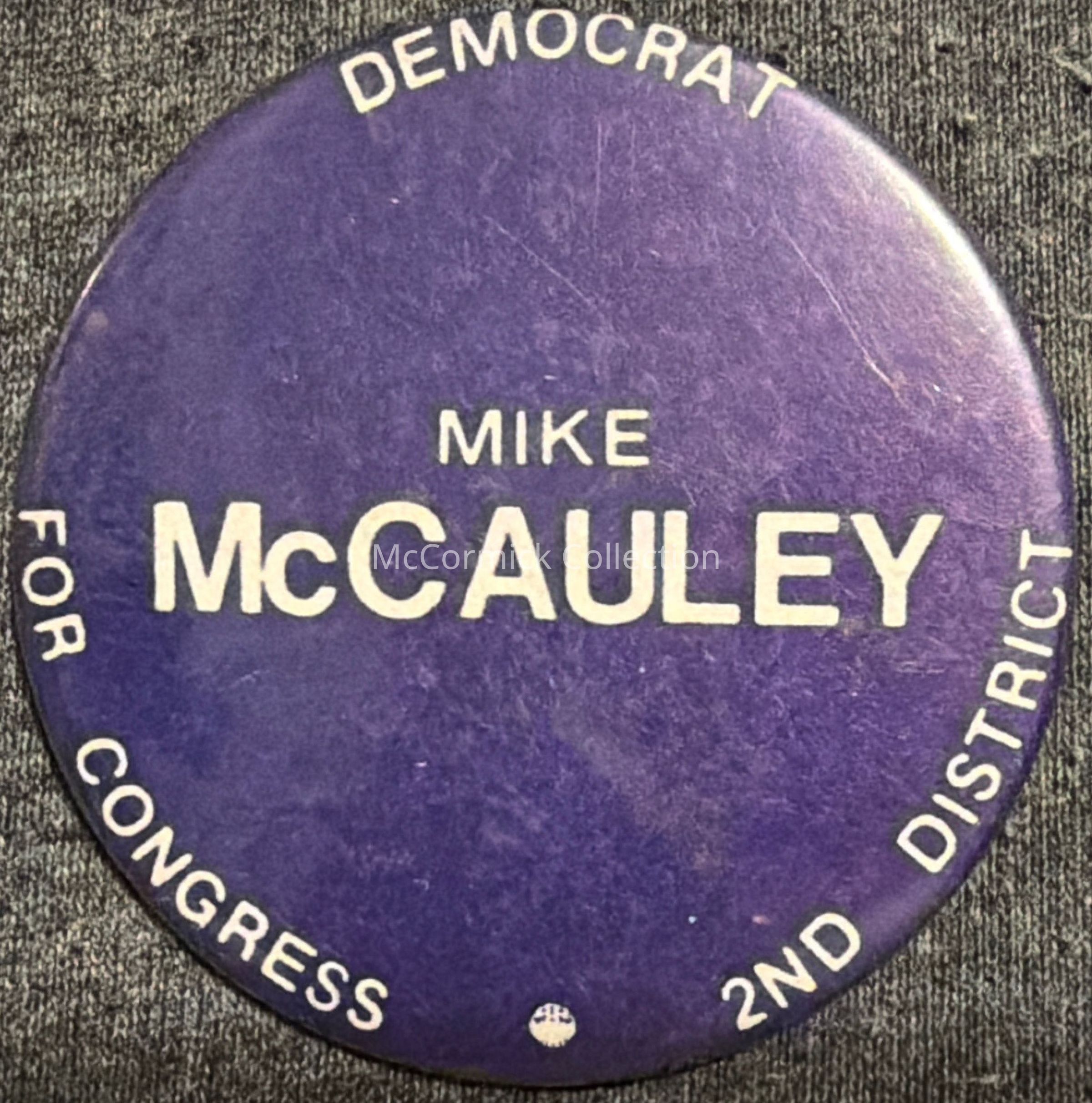 A 2.25” purple and white political button for Democrat Mike McCauley for Congress, 2nd district.