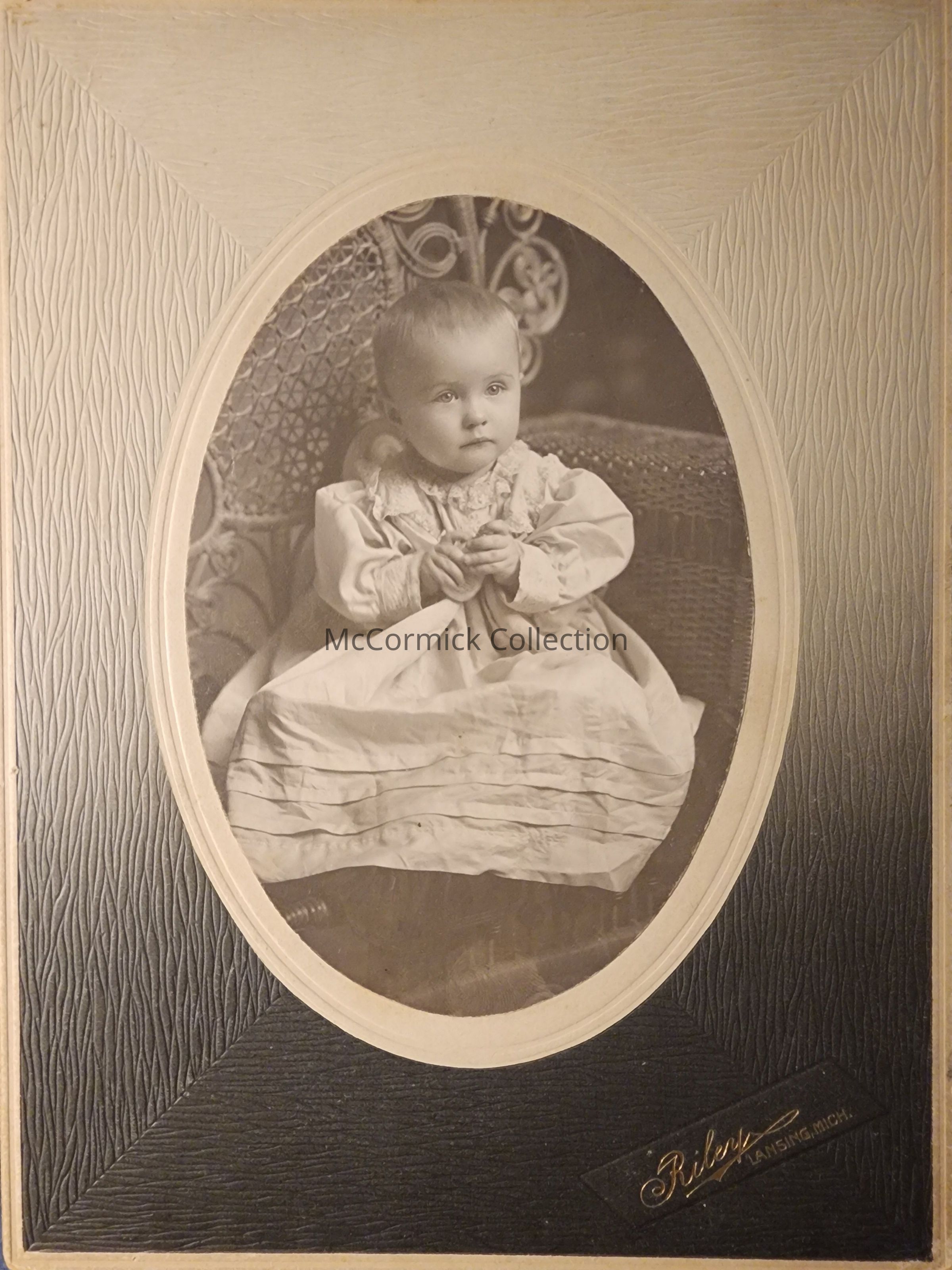 Card mounted photograph of a child identified as Mildred by Lansing photographer Riley.