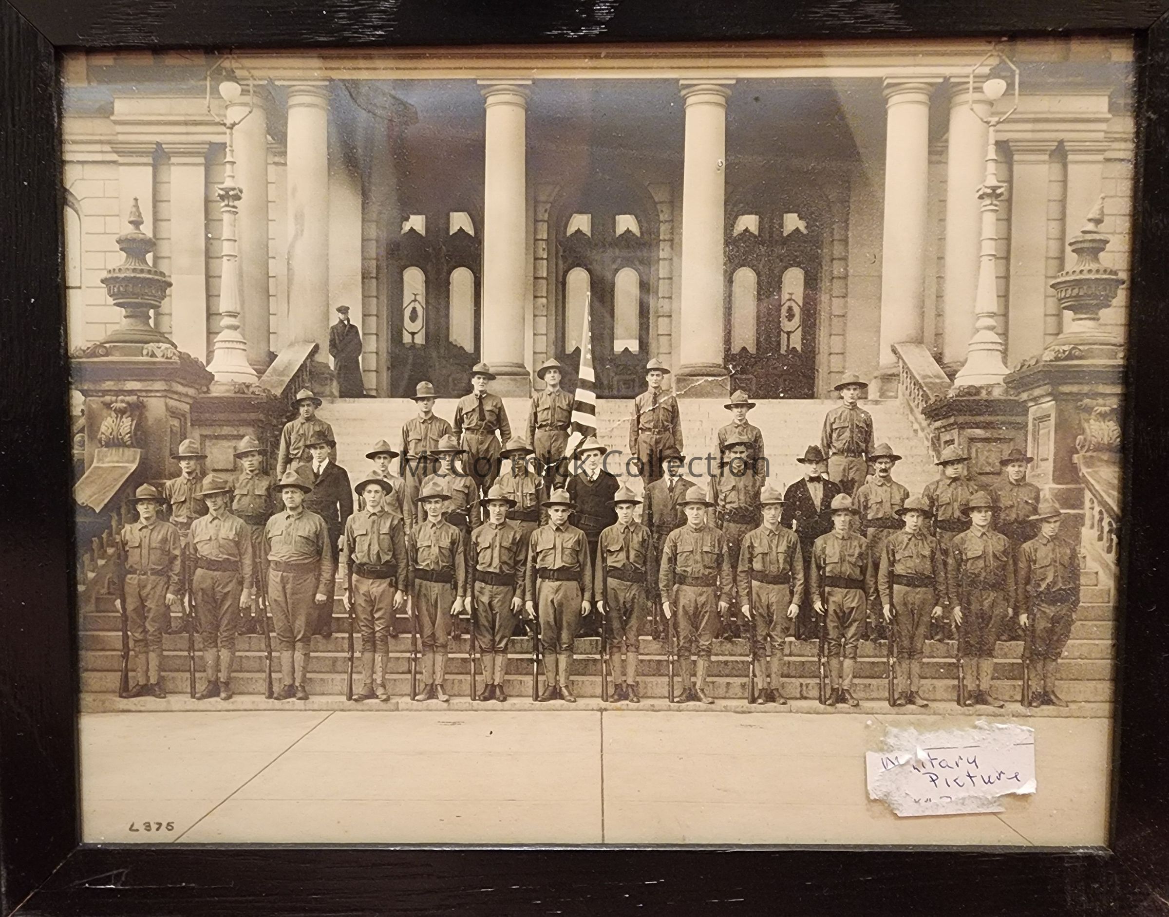 Framed photograph of a military group or regiment on the Michigan State Capitol steps, circa World War I.