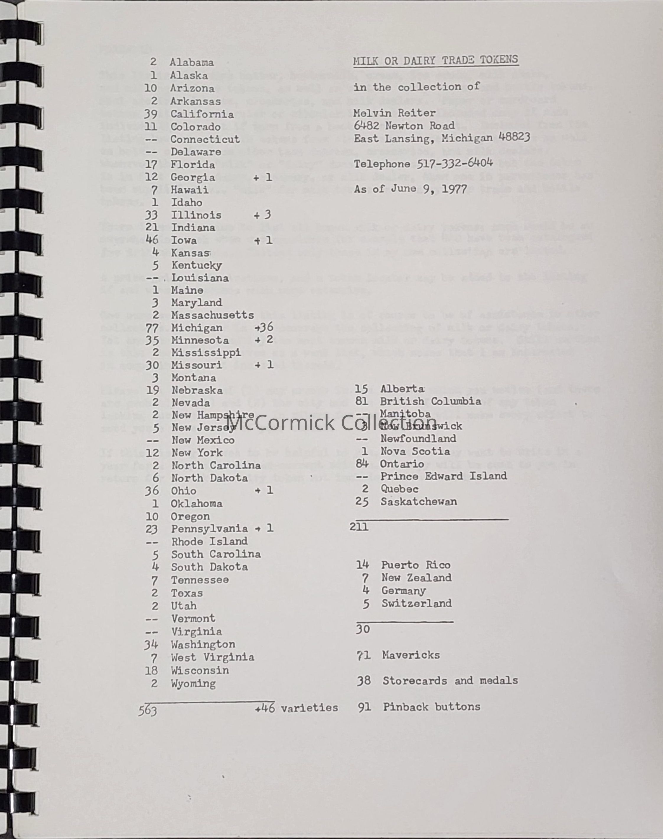 Milk or Dairy Tokens Guide by Reiter (1977)