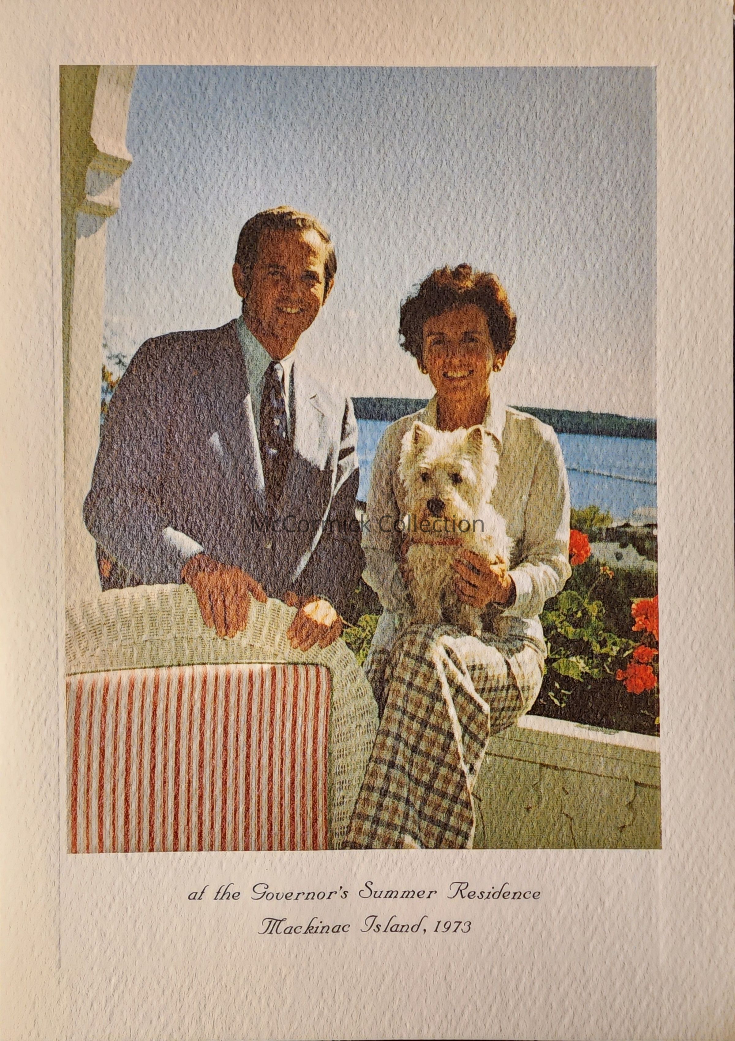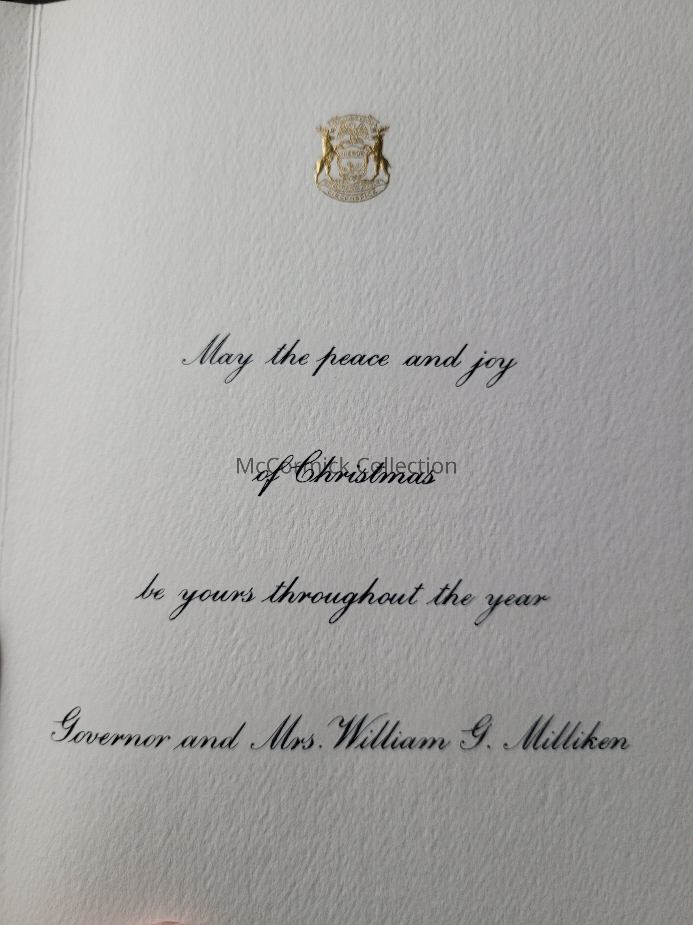 The 1973 Milliken family Christmas card featuring William and Helen Milliken and a photo taken at the Mackinac Island governor's residence.