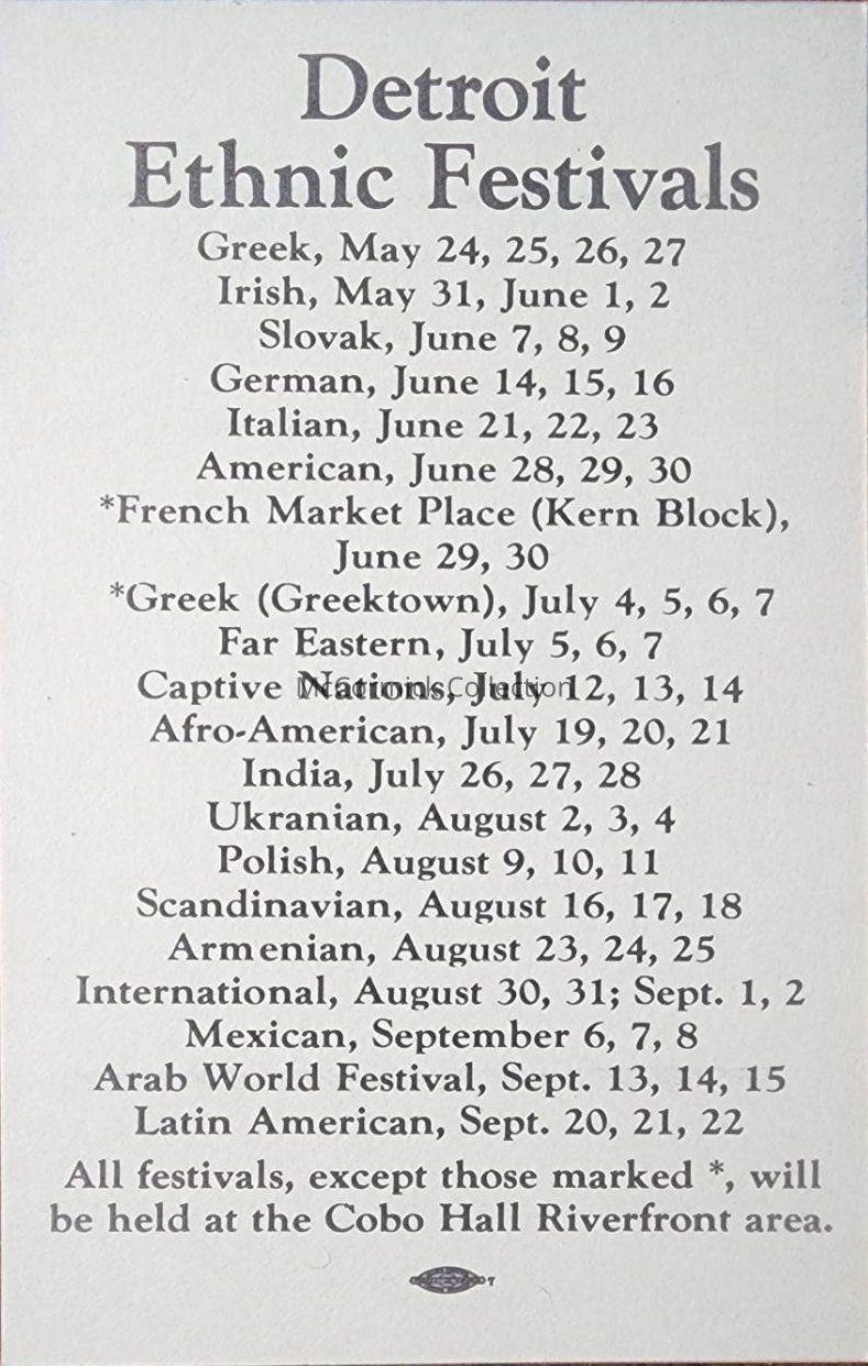 A card for Gov. William Milliken with schedule for Detroit Ethnic Festivals.