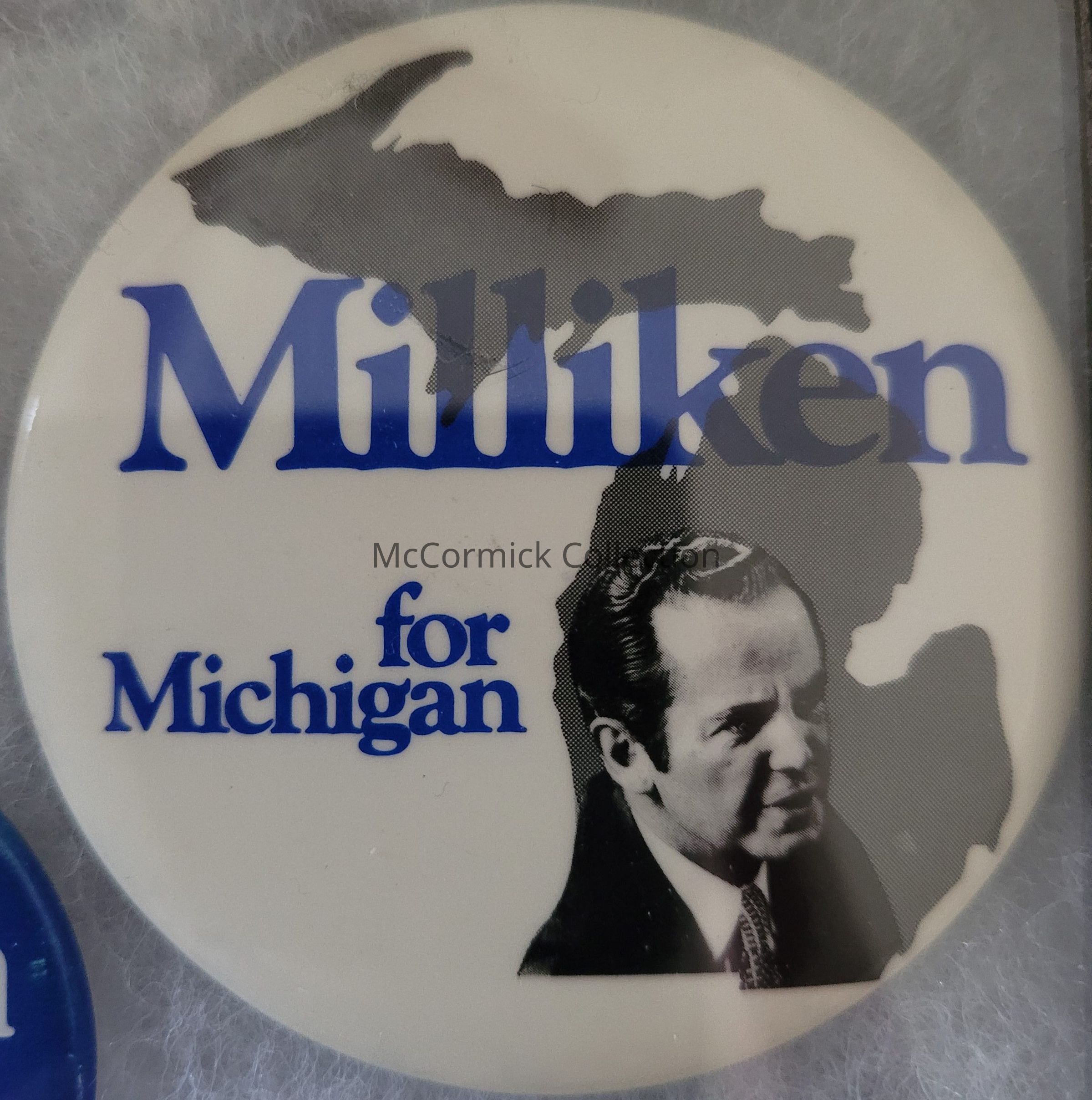 A 2.5" blue, white, and grey political button for William Milliken for Governor, circa 1970s.