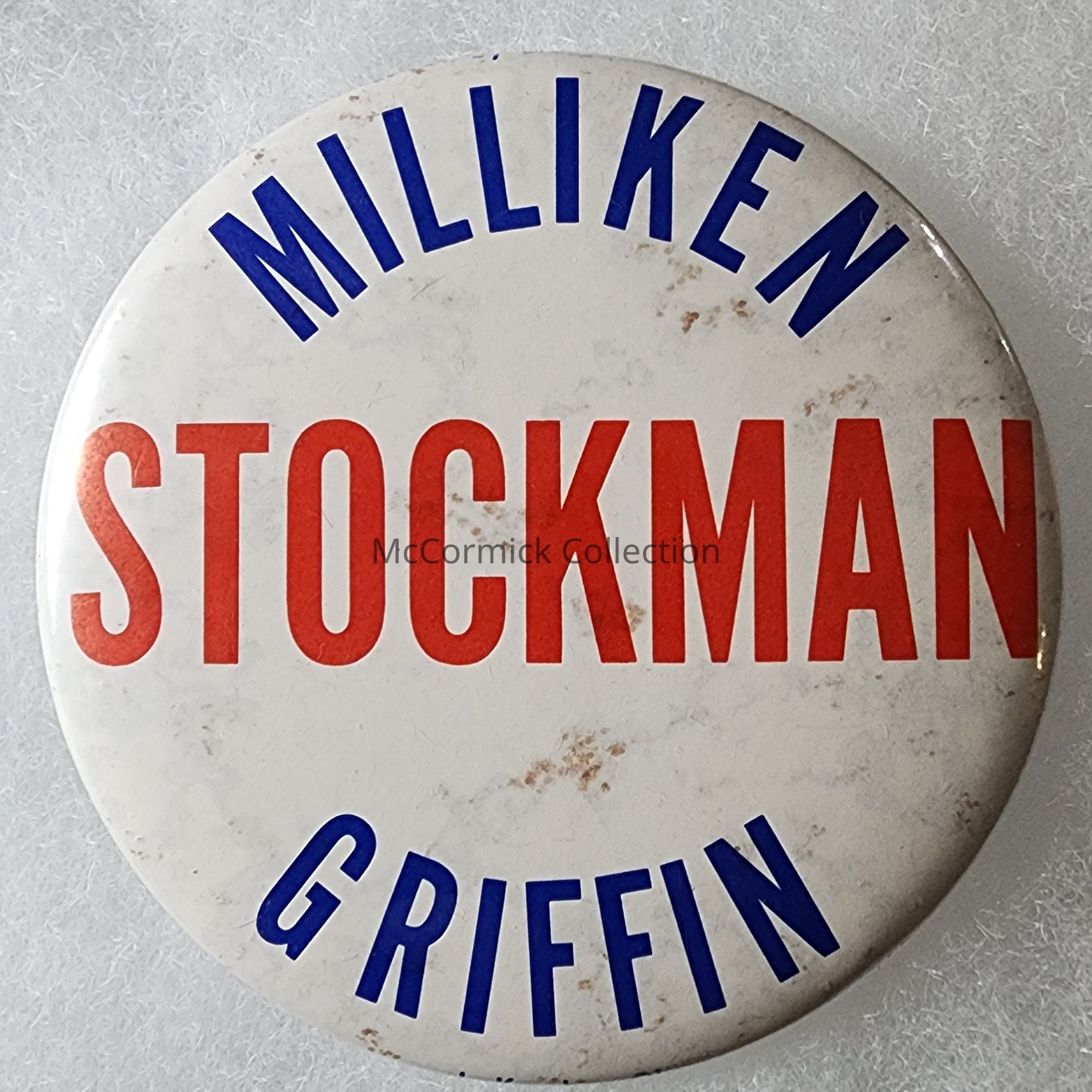 A 4" red, white, and blue coattail political button for William Milliken for Governor, Robert Griffin for U.S. Senate, and David Stockman for Congress. Distributed by the Branch County G.O.P. Circa 1977.
