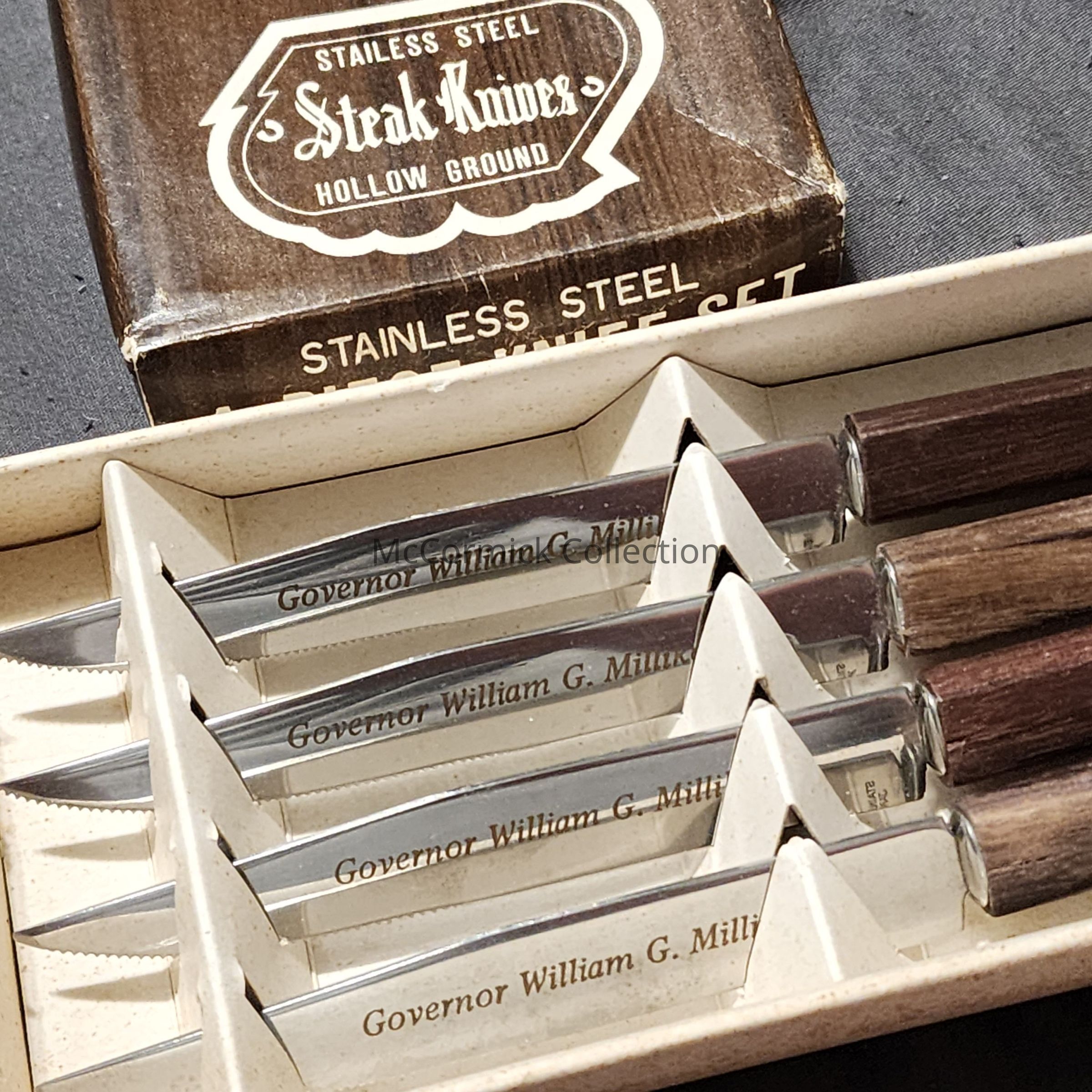 A box and set of four matching stainless steel steak knives distributed by Governor William Milliken.