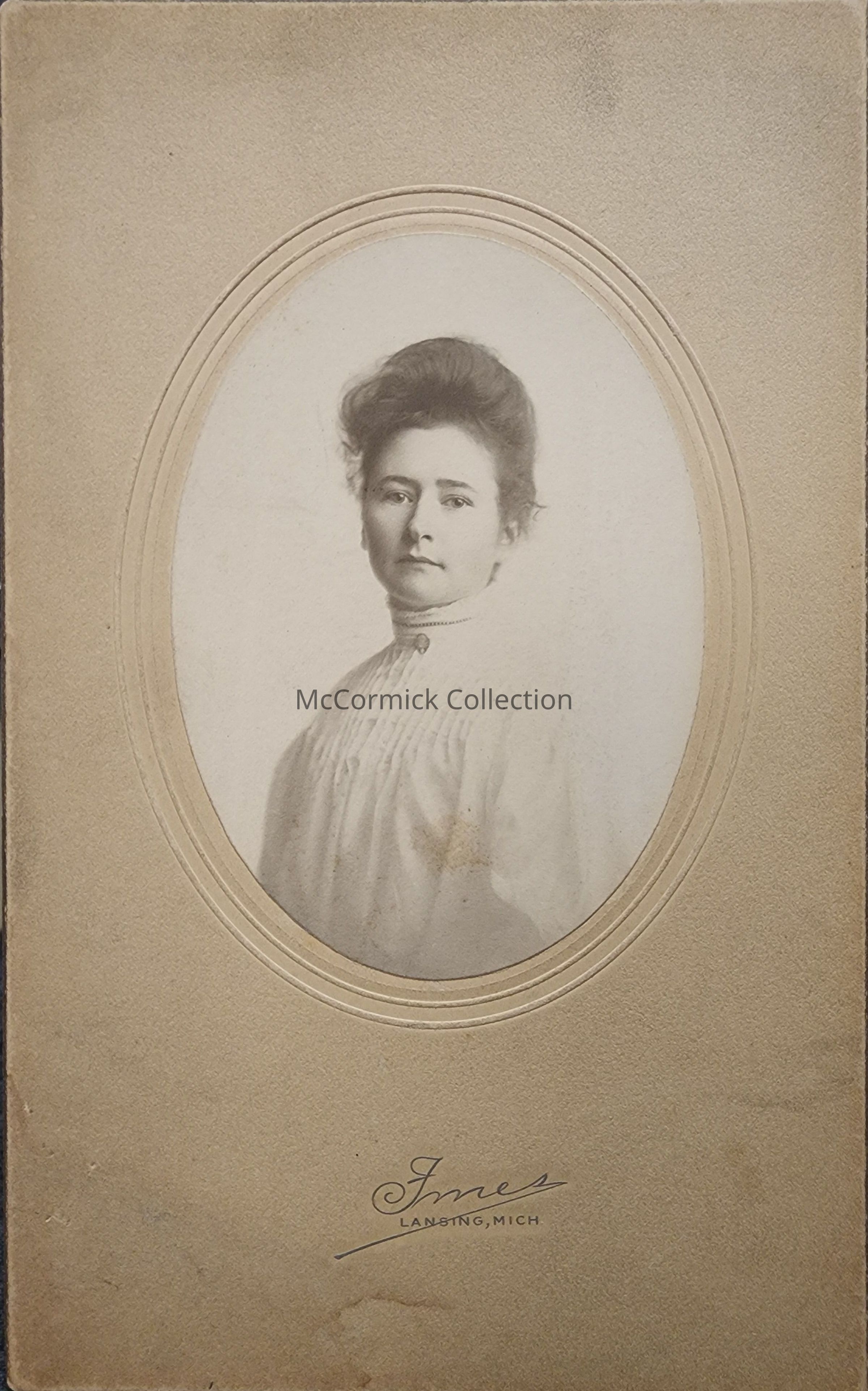 Card mounted photograph identified as Miss Harvey, once a Sunday School teacher, by Lansing photographer Imes.