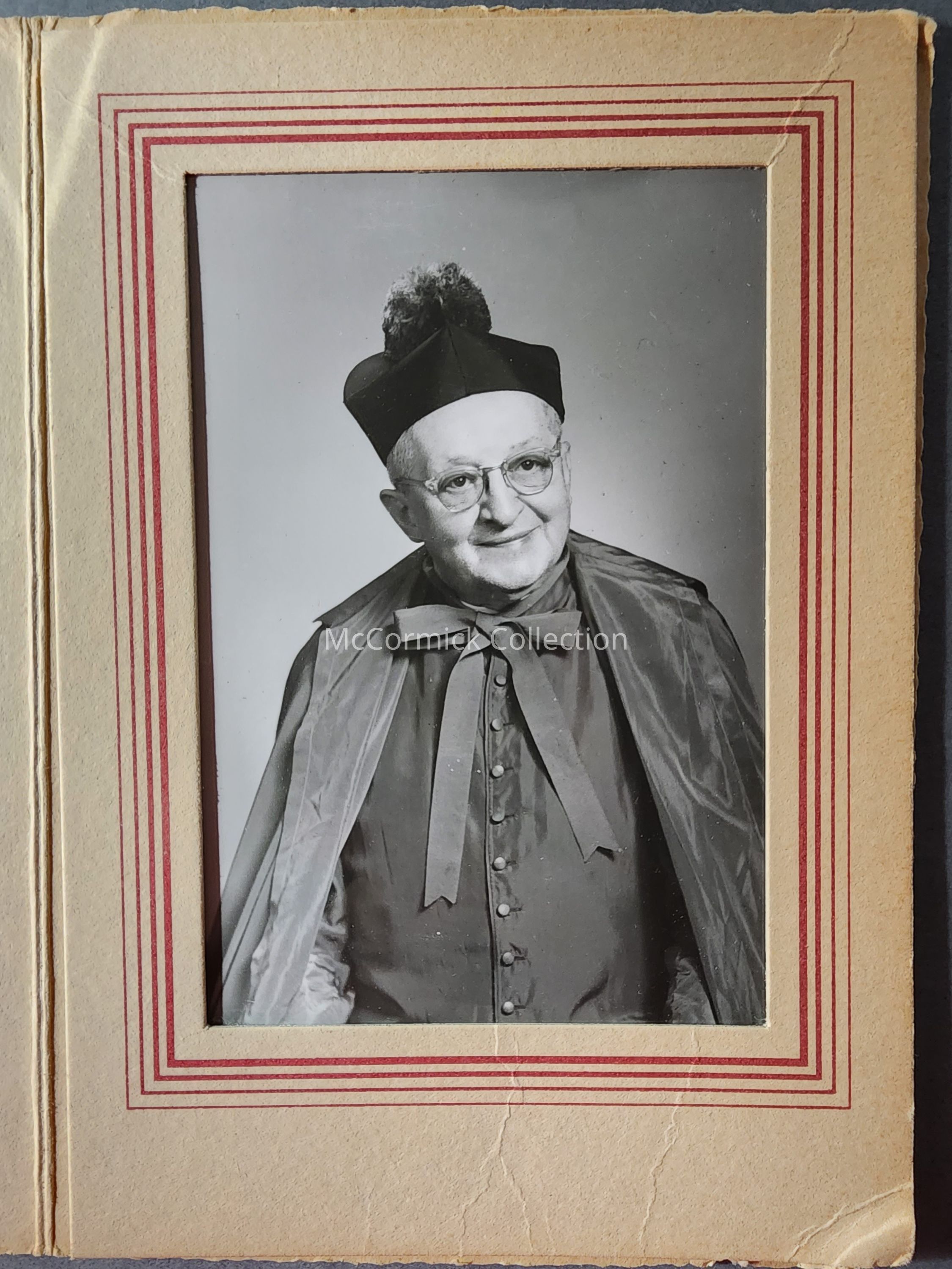 Portrait photograph of Monsignor Gabriels of Resurrection Church in Lansing. No photographer, photo mounted in brown and red cardboard folder/frame. From the DeMarco Estate.