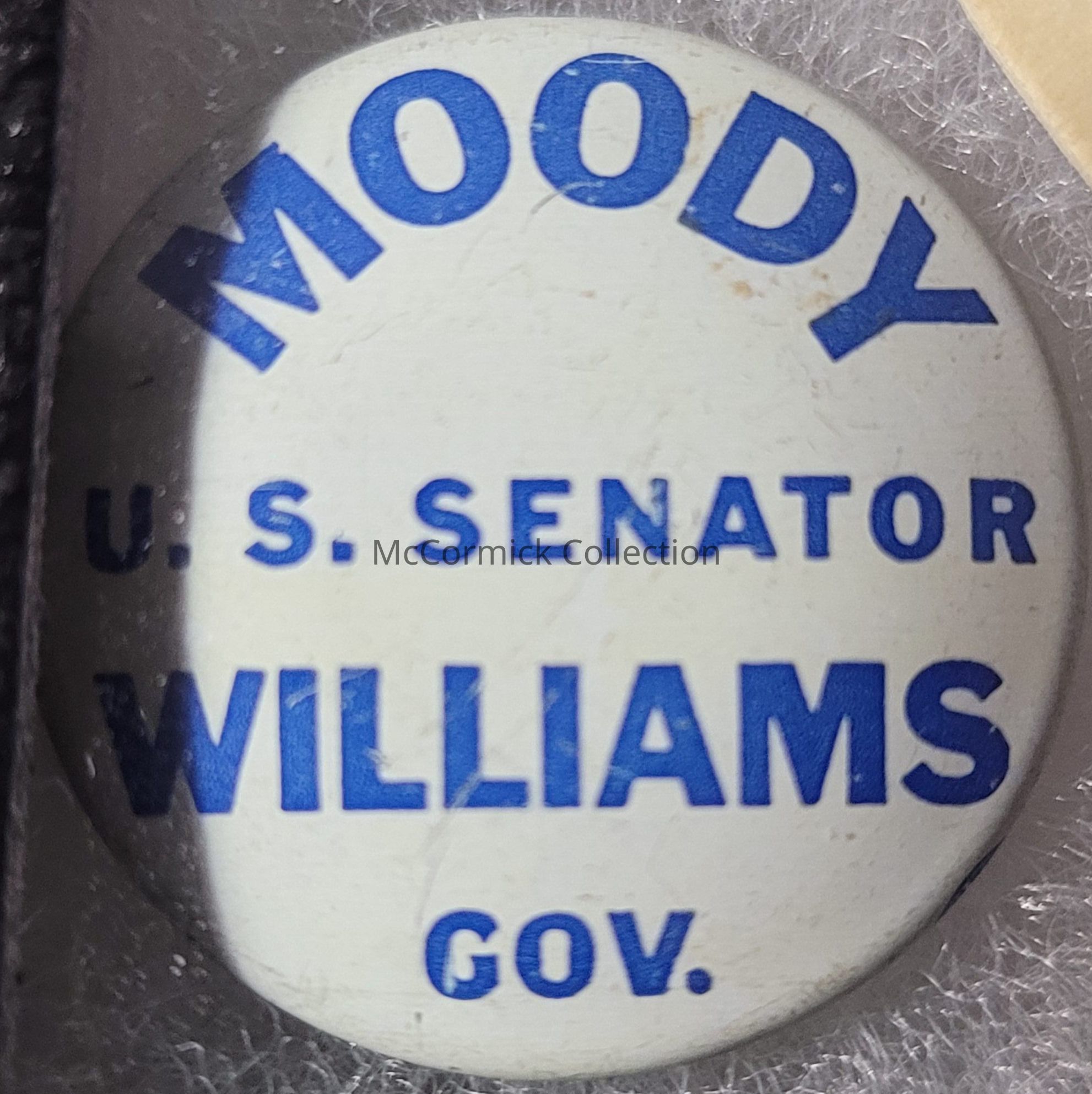 Political Button, 1", coattail for Blair Moody for U.S. Senator and G. Mennen Williams for Governor. Blue and white button.