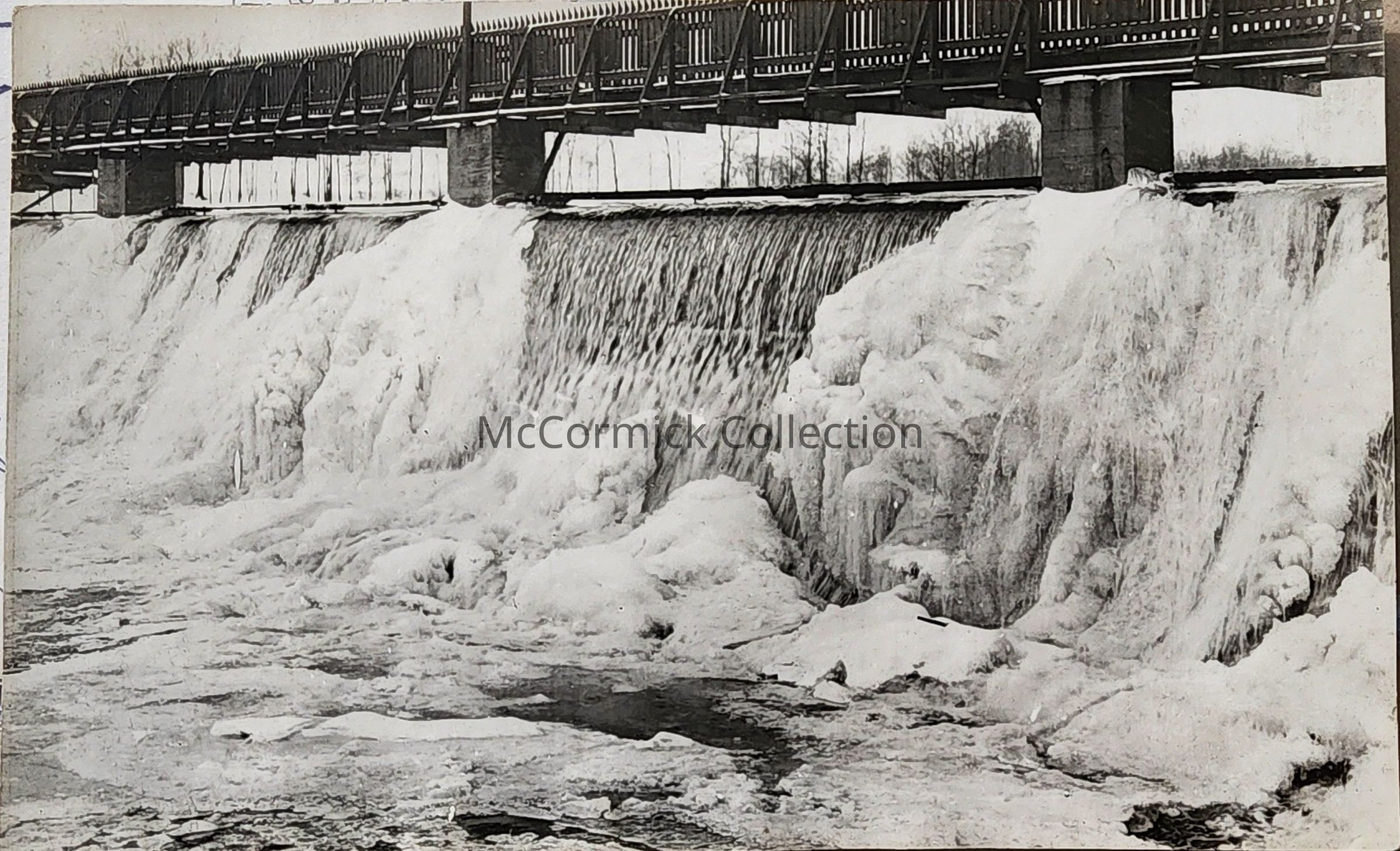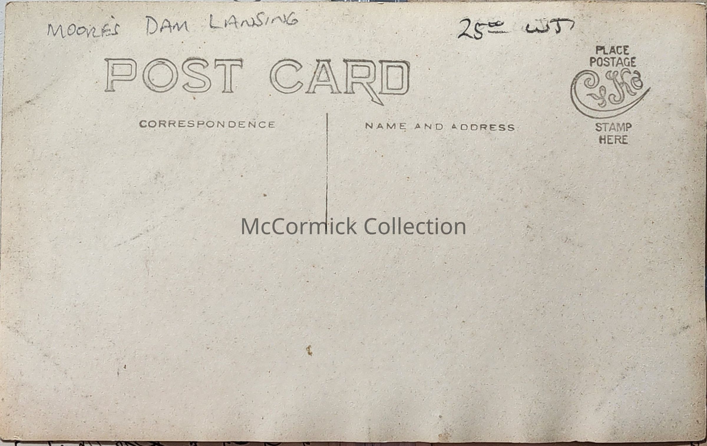 Real photo postcard of a closeup of the Moores Park Dam in Lansing, Michigan. Postally unused.