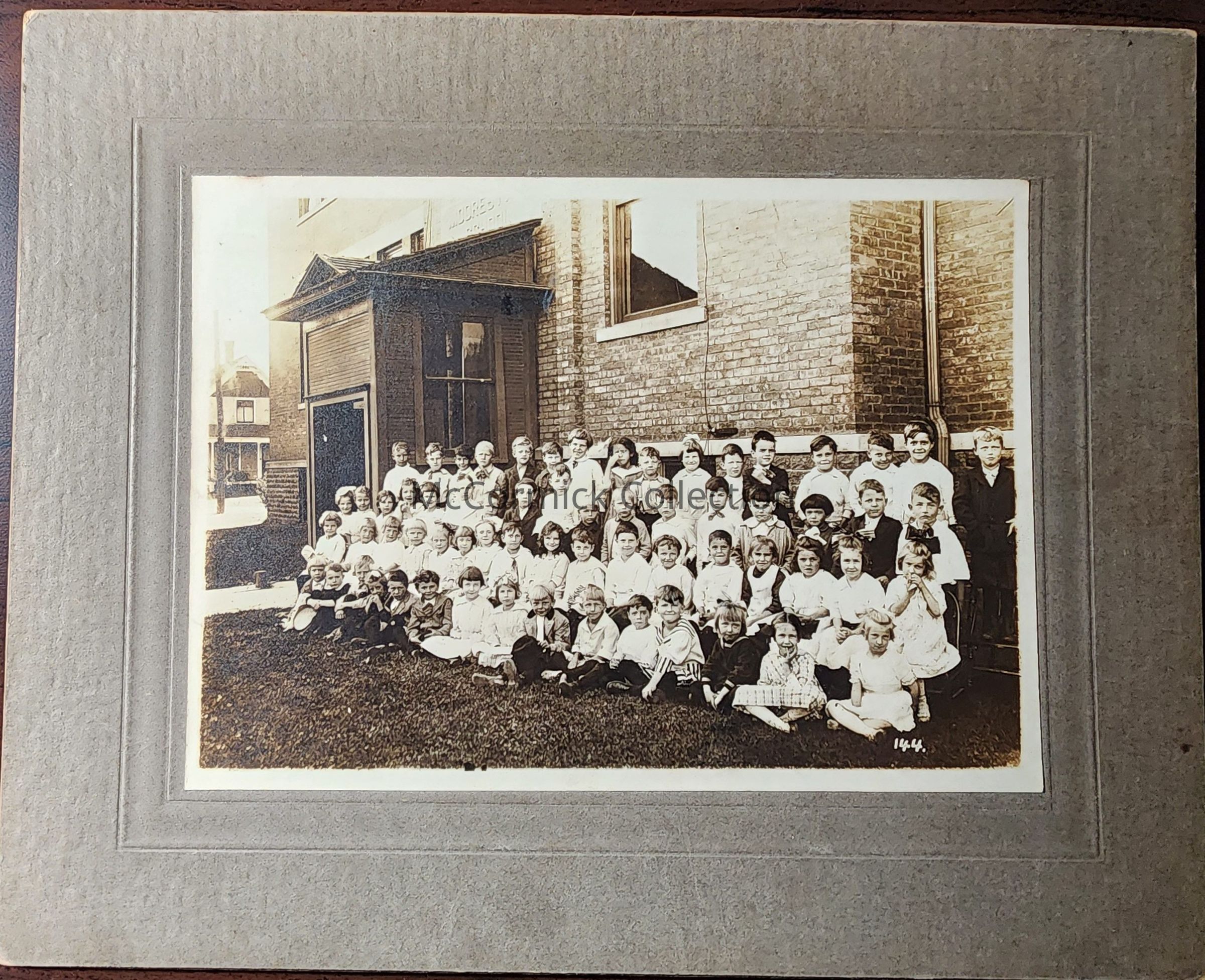 Card mounted photograph of a class at the Moores Park School. Photographer unidentified. Negative number is 144. Students identified on back in pencil.