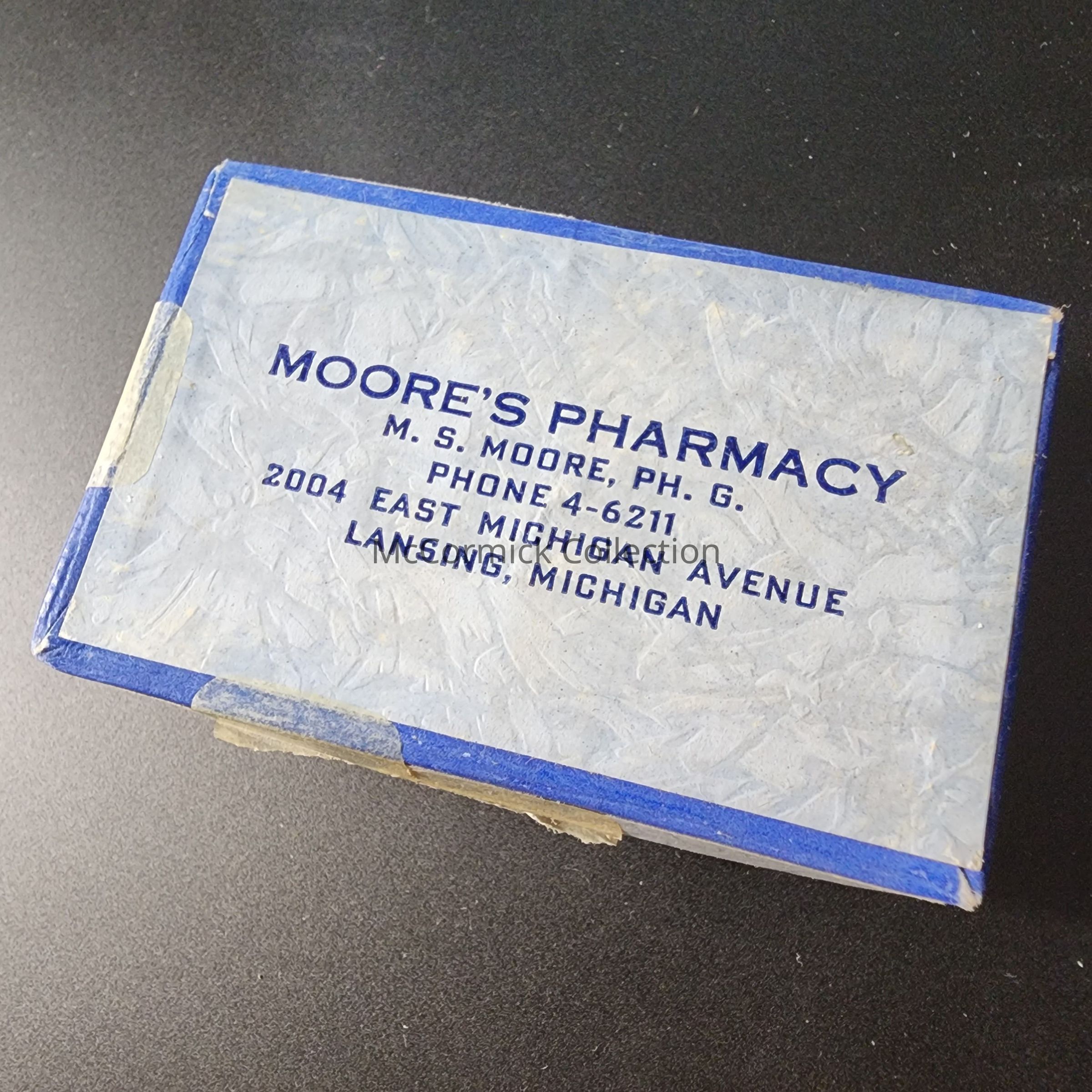 Advertising prescription box from Moore's Pharmacy, M.S. Moore, Ph.G. From Siebert Estate.