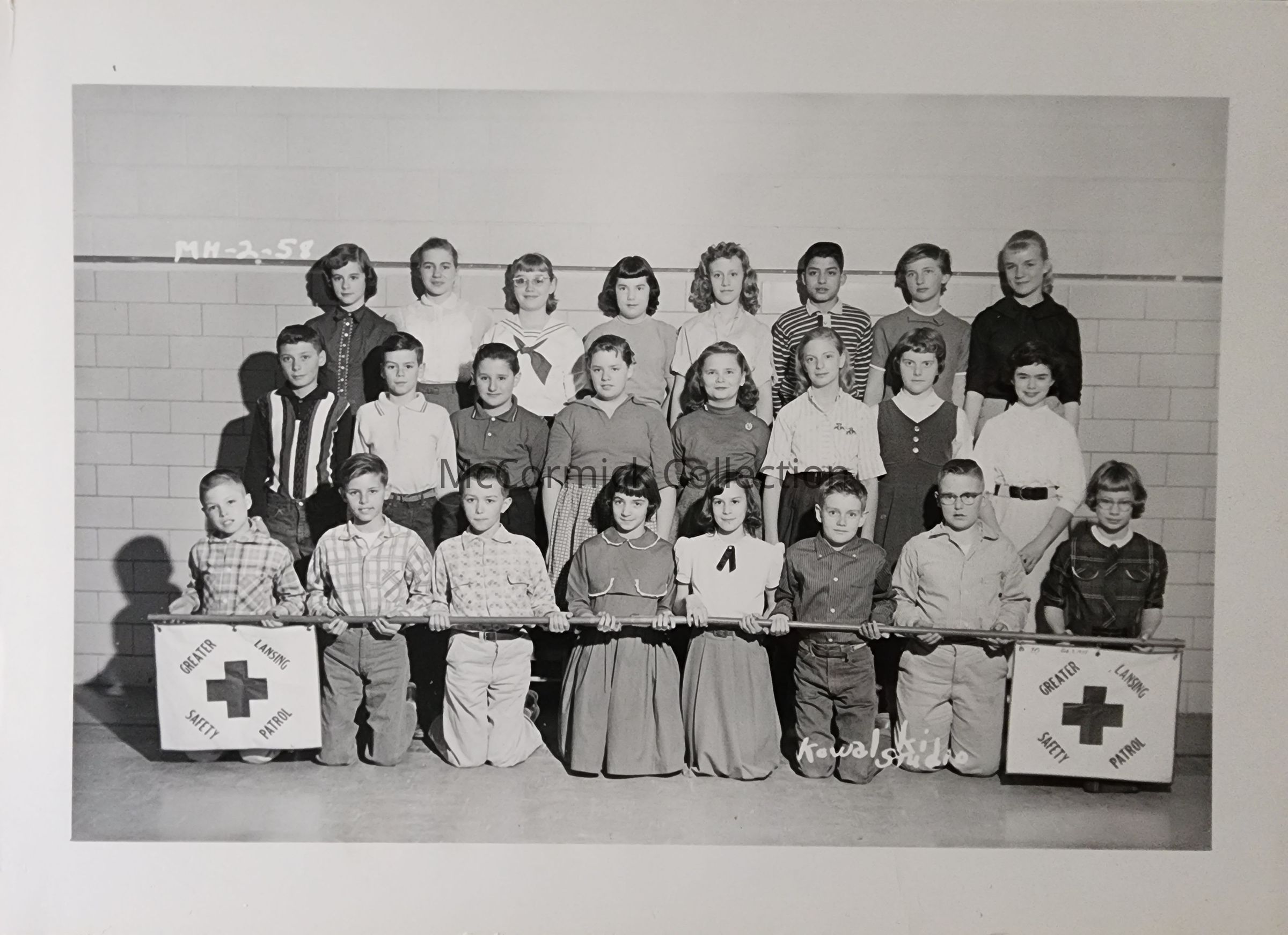 Photograph of the Mount Hope School 1958 second grade Greater Lansing Safety Patrol. Photo by Lansing photographer Kowalski.