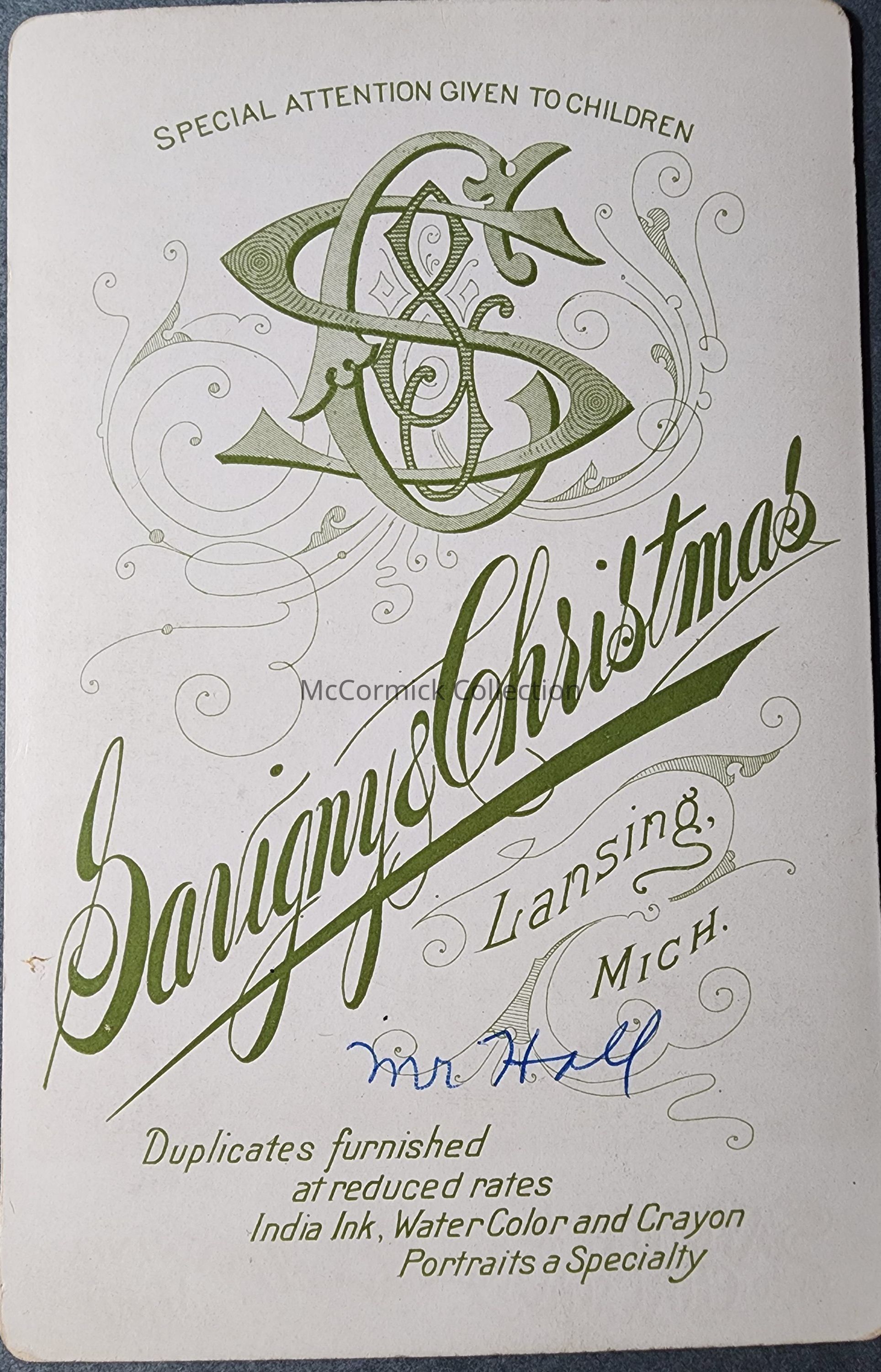 Cabinet card photograph of Mr. Hall by Lansing photographer Savigny and Christmas.