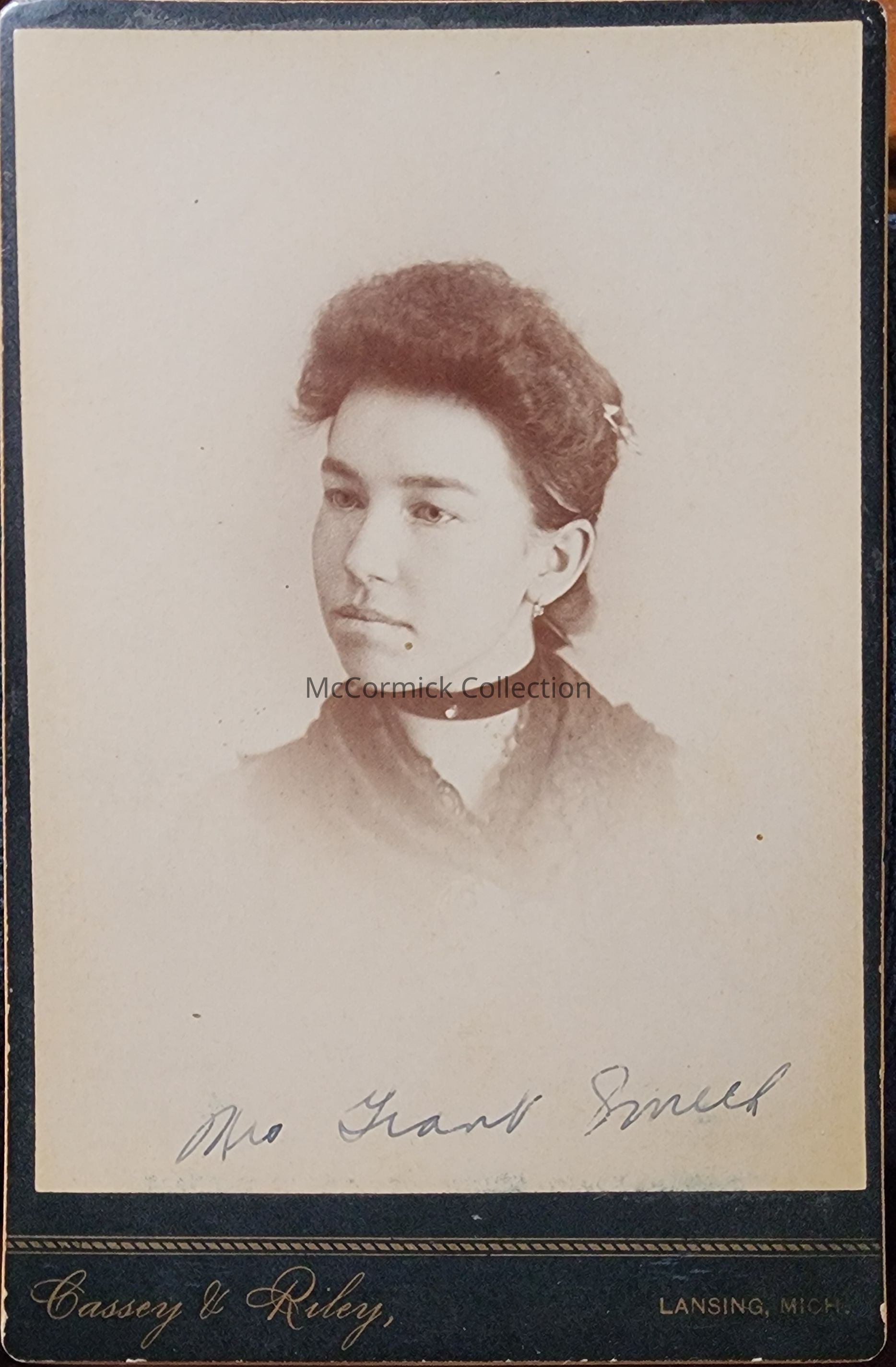 Cabinet card photograph of a woman identified as Mrs. Grant Smith by Lansing photographer Cassey and Riley.