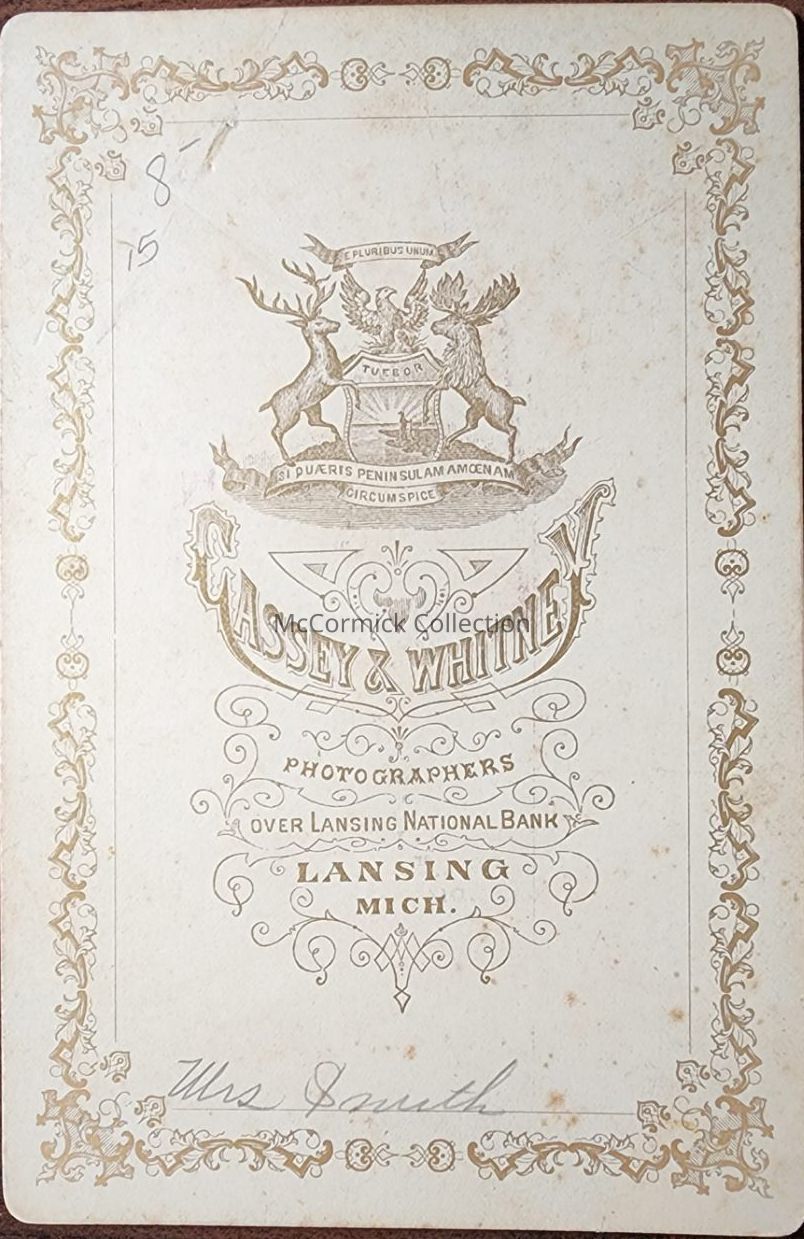 Cabinet card photograph of Mrs. Smith by Lansing photographer Cassey and Whitney.