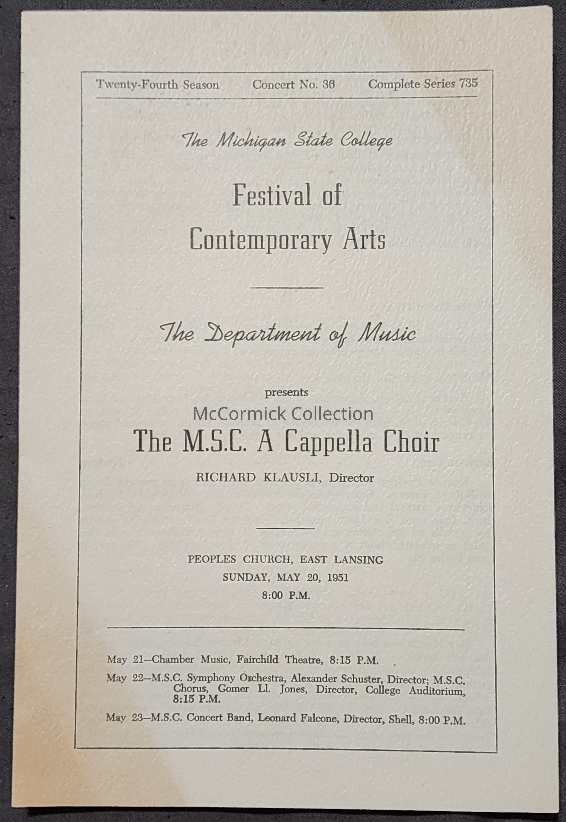 Features Michigan State College A Capella Choir. People's Church concert.