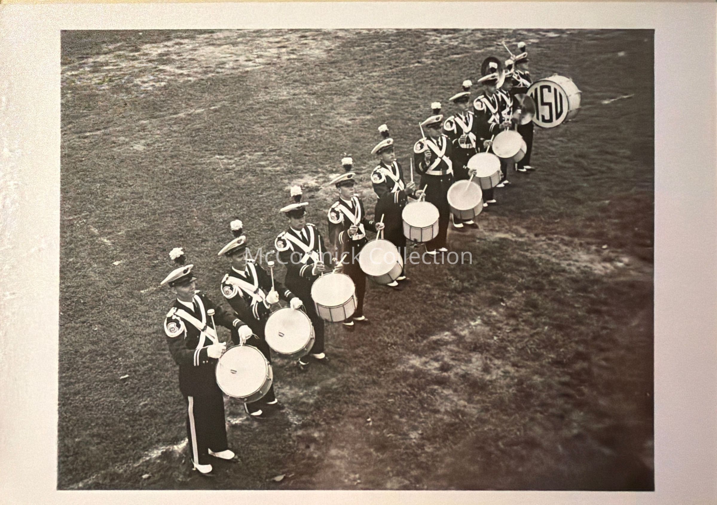 Photographic print of the Michigan State University Spartan Marching Band drumline, circa 1950s. From the Charles Ross collection.