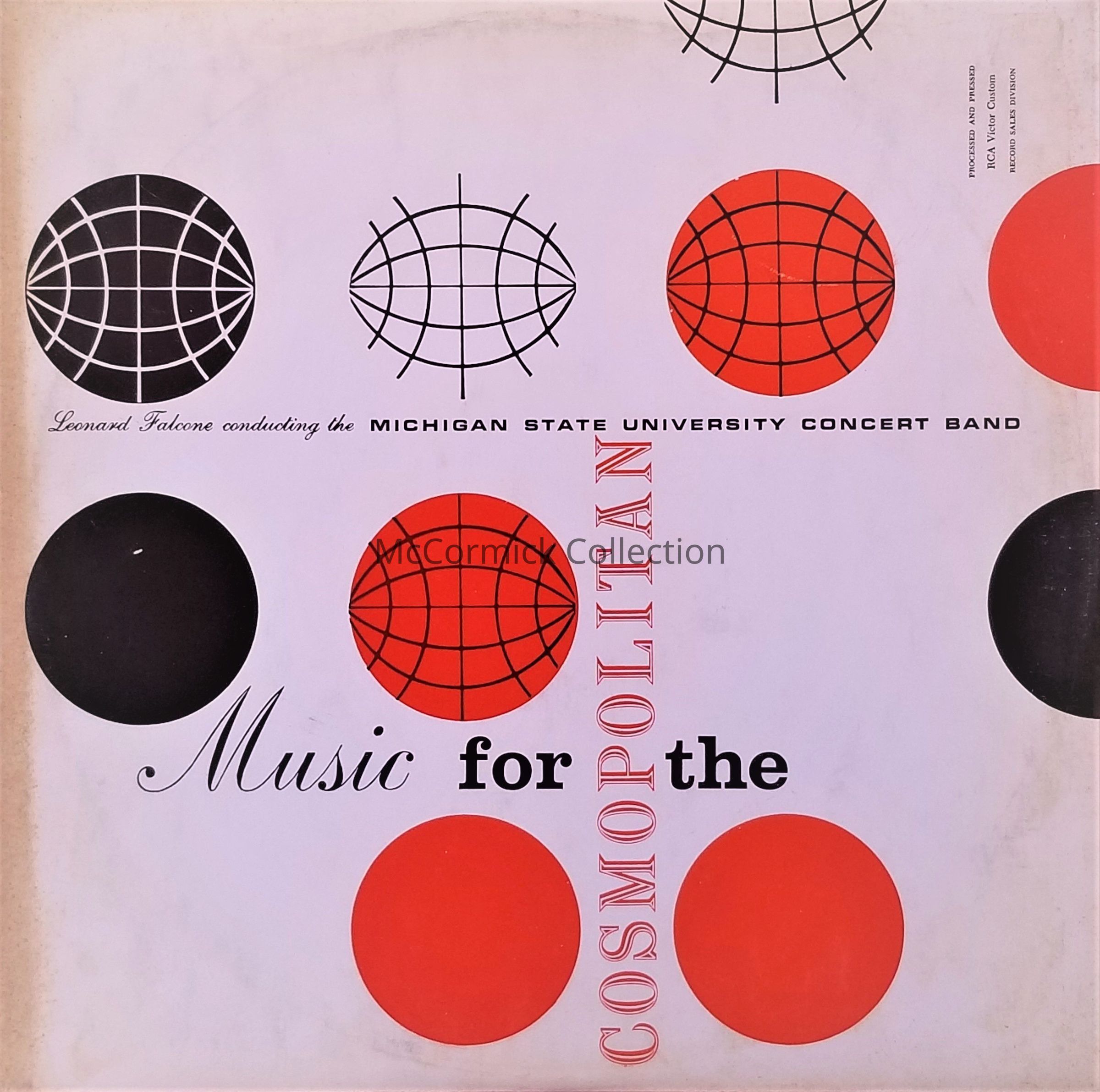 A 1957 record of the Michigan State University Concert Band under the direction of Leonard Falcone. Titled "Music for the Cosmopolitan."