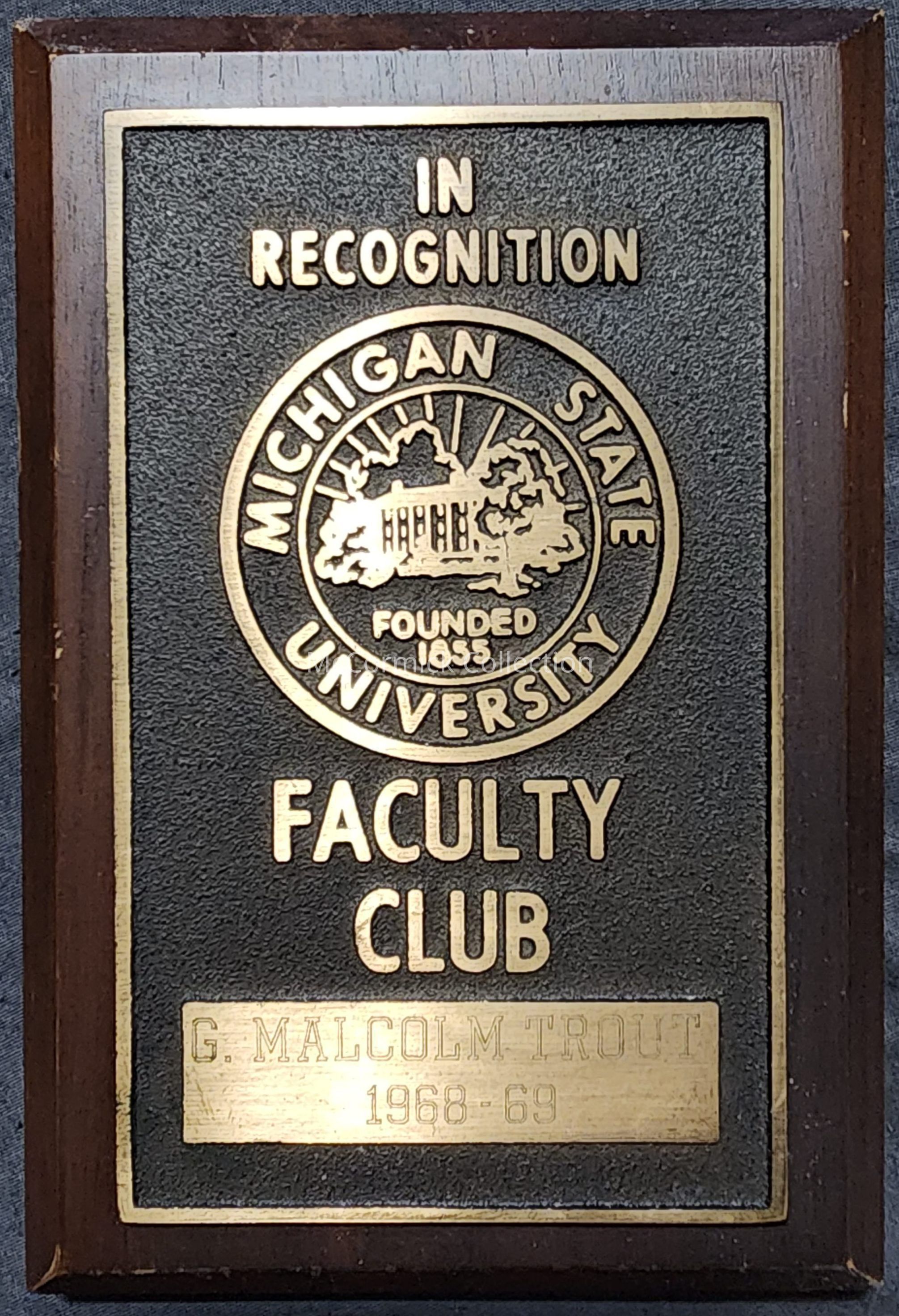 Small plaque from the family of MSU dairy professor G. Malcolm Trout, which reads" In Recognition / Faculty Club / G. Malcolm Trout 1968-69."