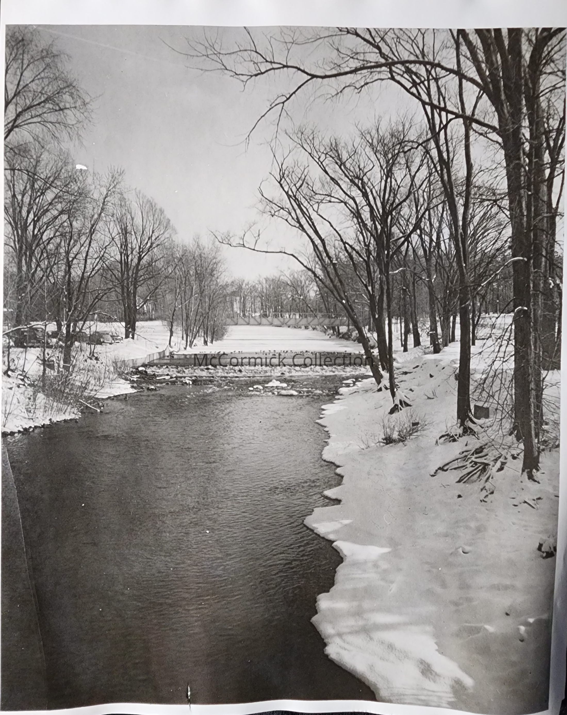 A snapshot photograph of a river scene on the Red Cedar River on the campus of Michigan State University in East Lansing, circa 1950s-60s. A pedestrian bridge over the river is visible.