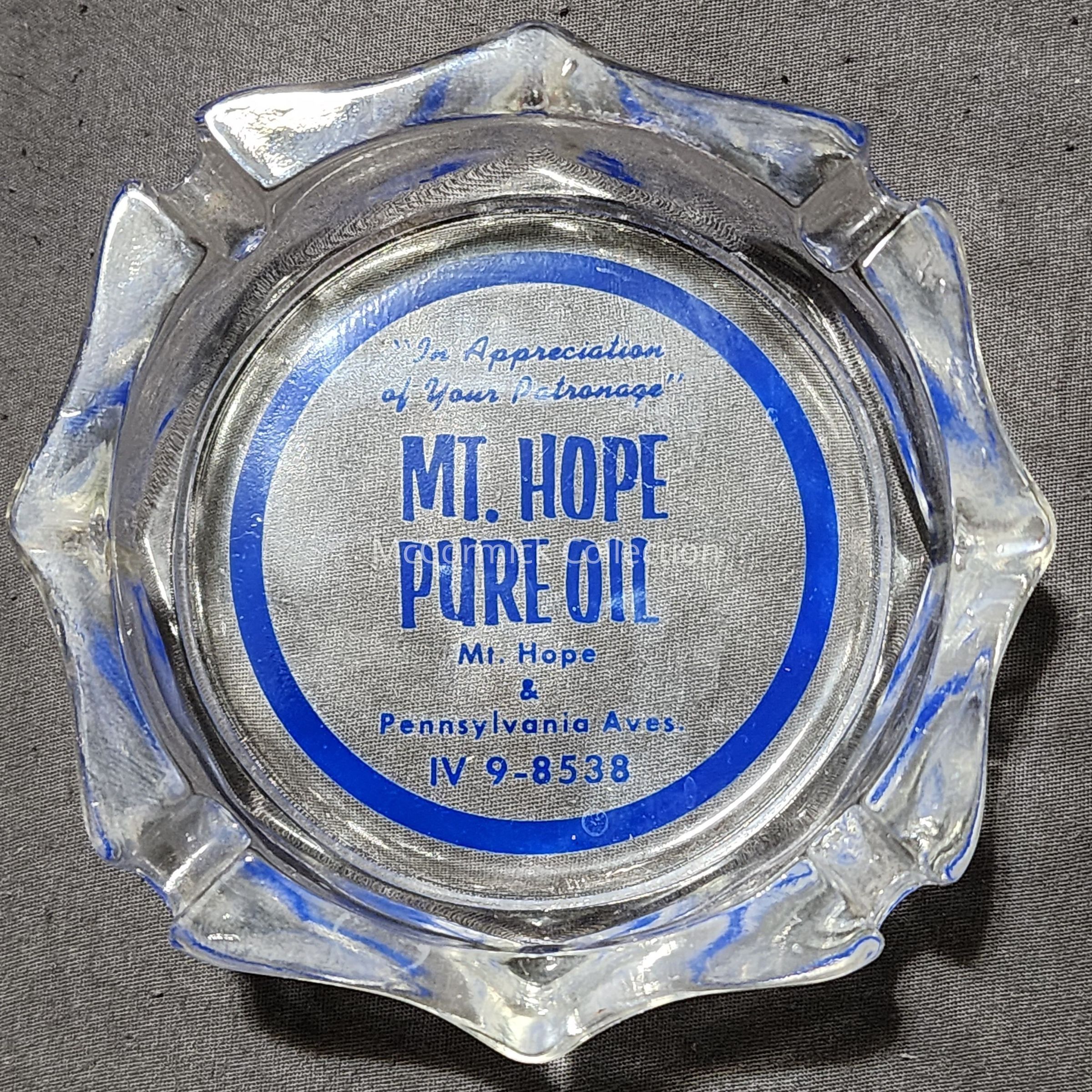 A glass advertising ashtray for the Mt. Hope Pure Oil station in Lansing, Michigan.