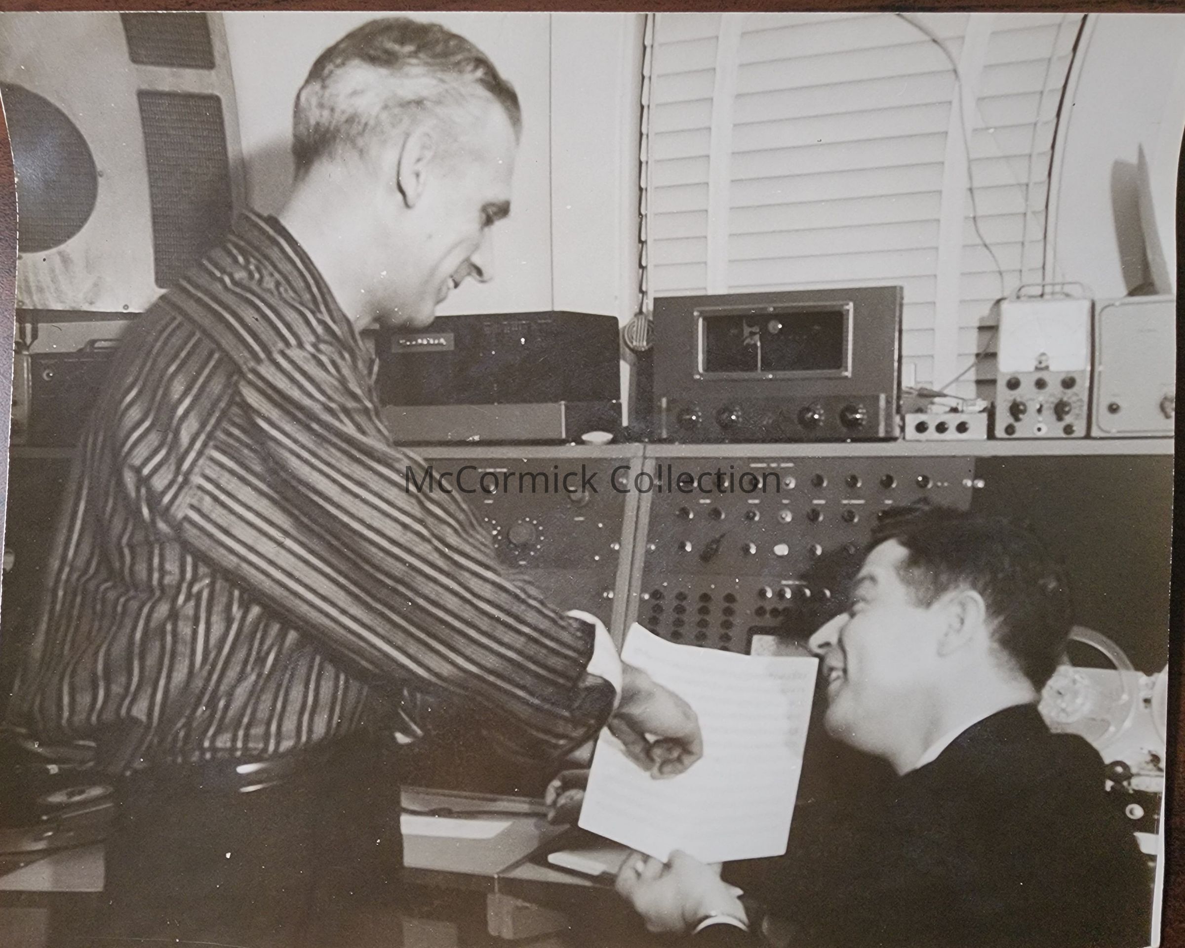 Photograph of two men in music production, related to Russell Siebert, Lansing native and longtime musician. From Siebert Estate.