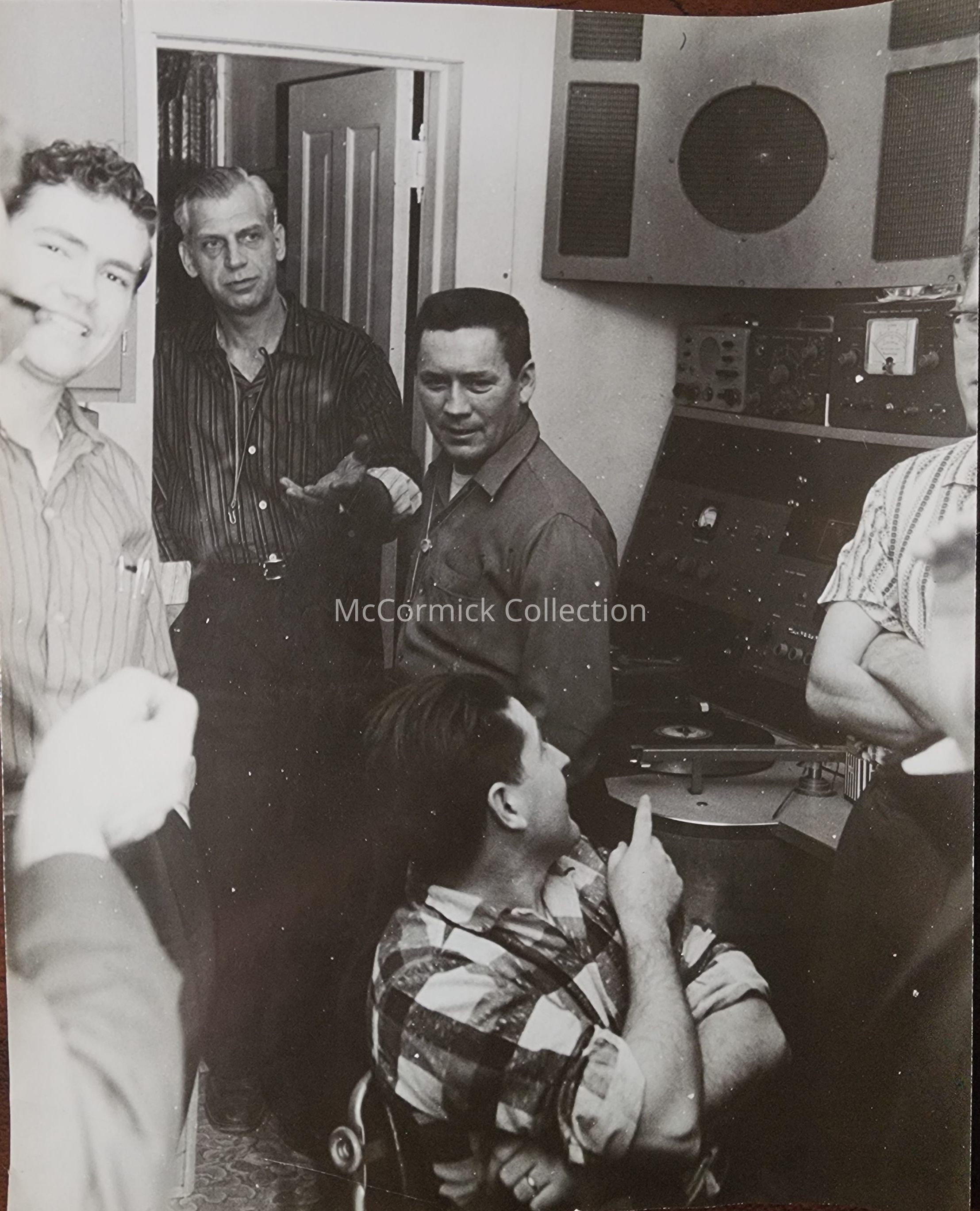 Photograph of a group of men in a music production studio, possibly in Lansing, Michigan. The man leaning in on the left resembles Don Lee Bloomquist, musician and producer from Lansing. Related to Russell Siebert.