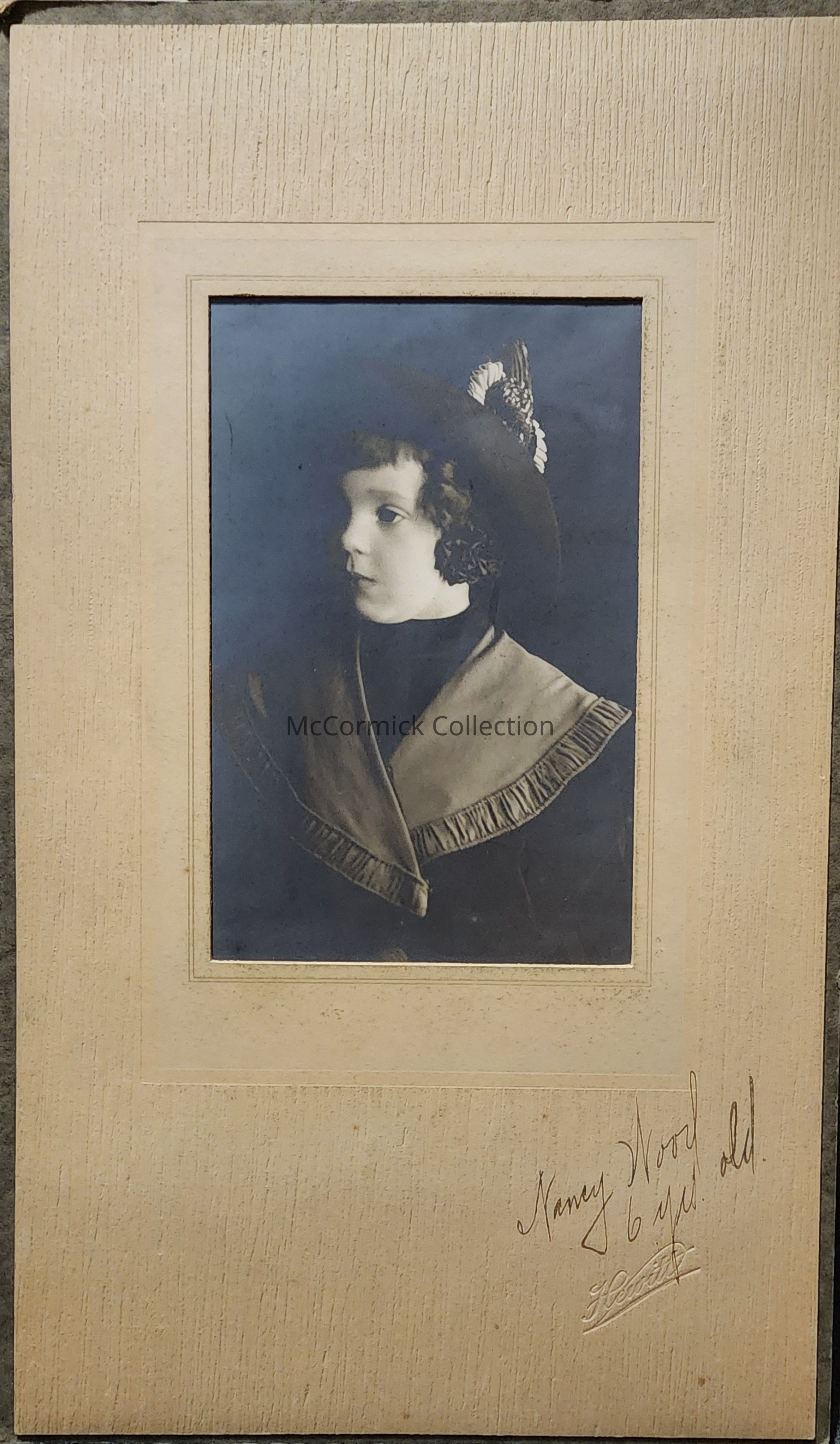 Card frame mounted photograph of 6 year old Nancy Wood by Lansing photographer Hewitt.