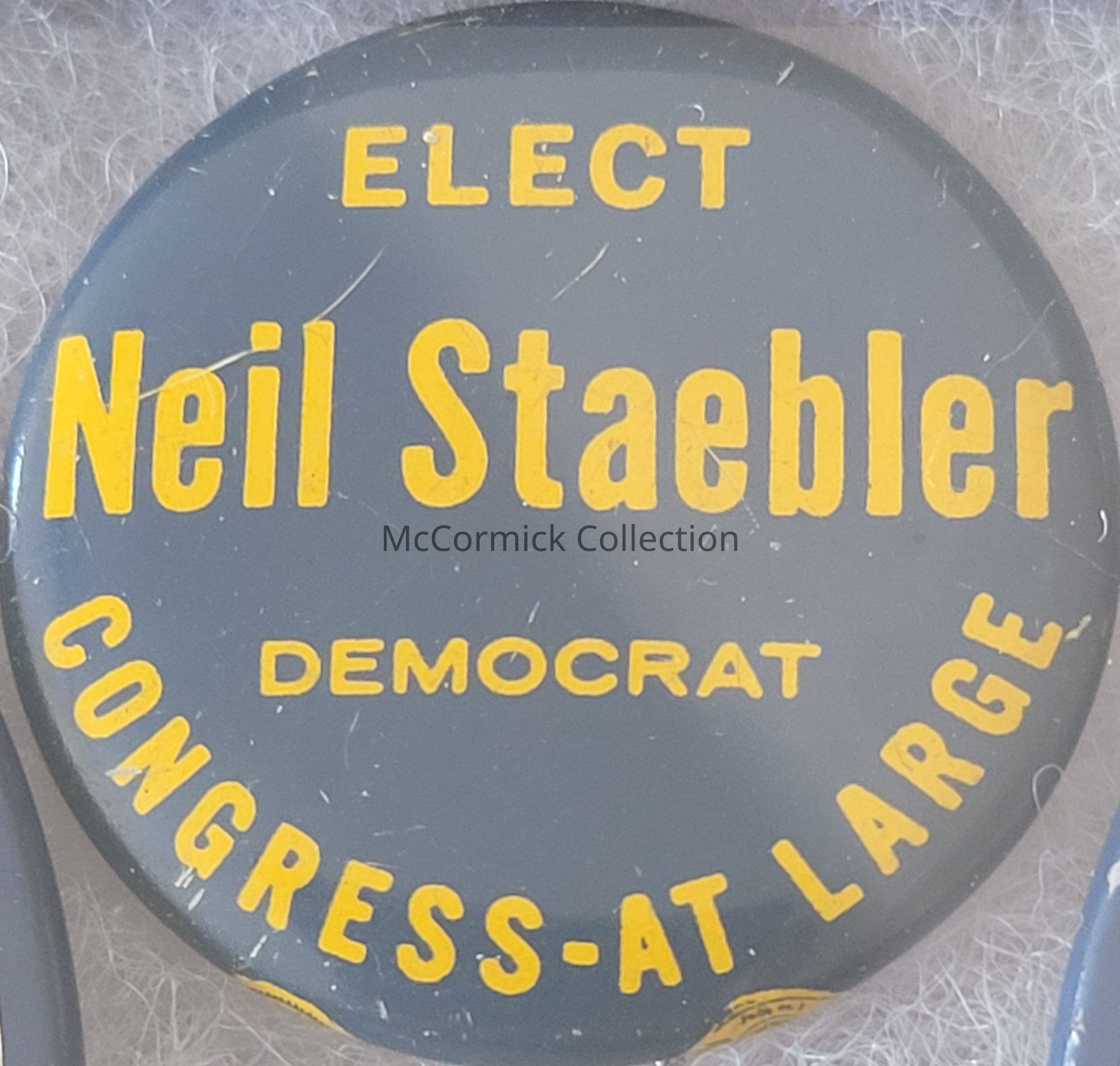 A 9/8" blue and yellow political button for Neil Staebler, Democrat, for Congress At Large, 1962.